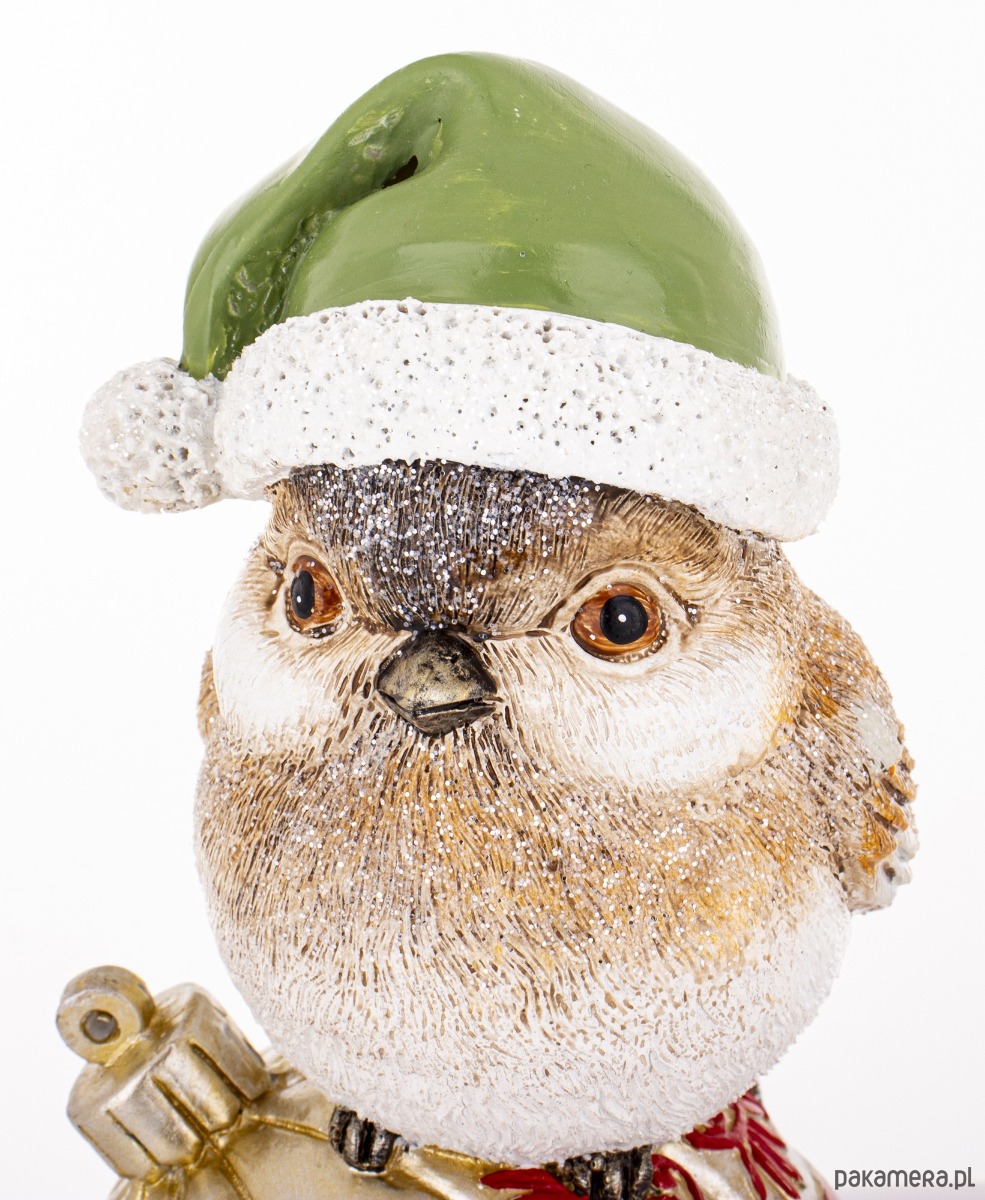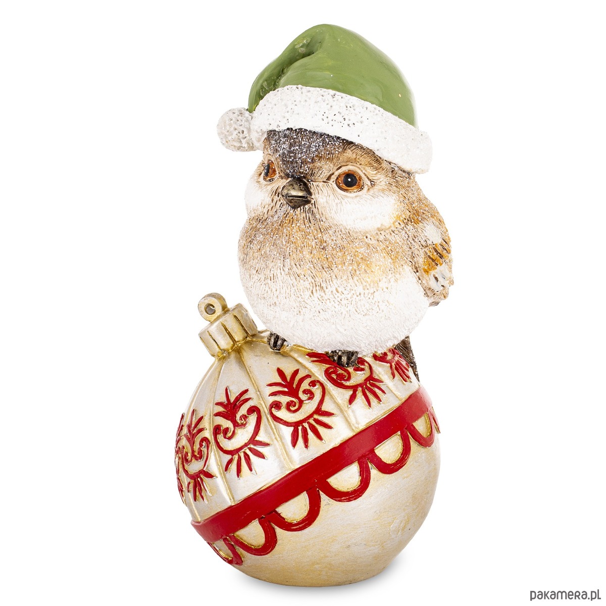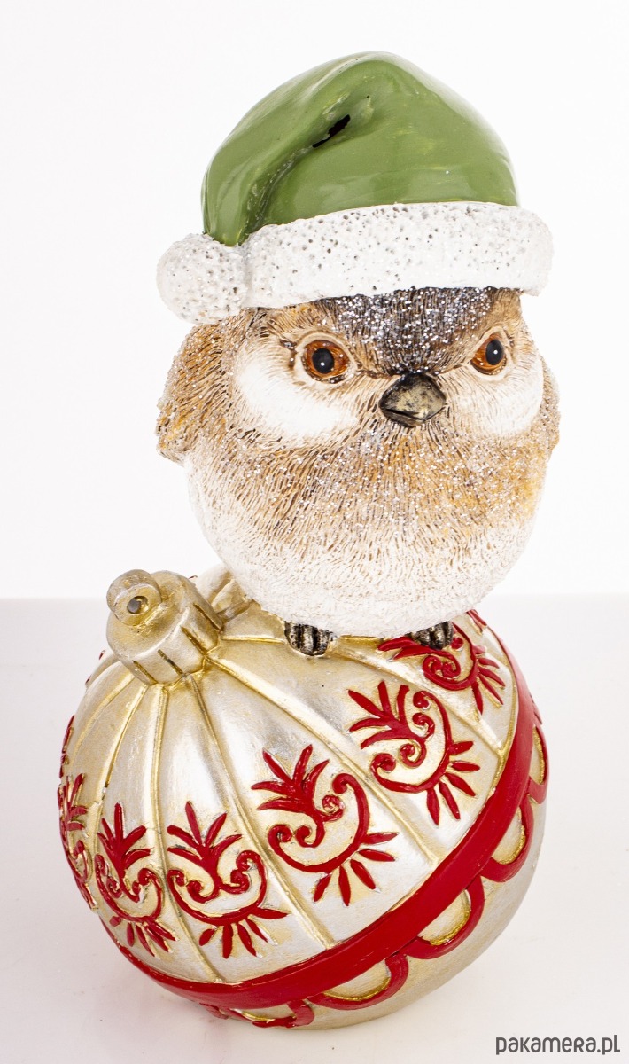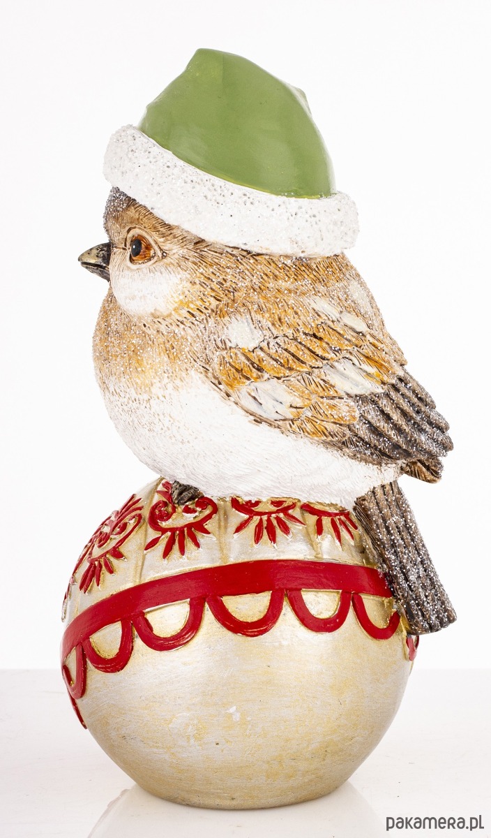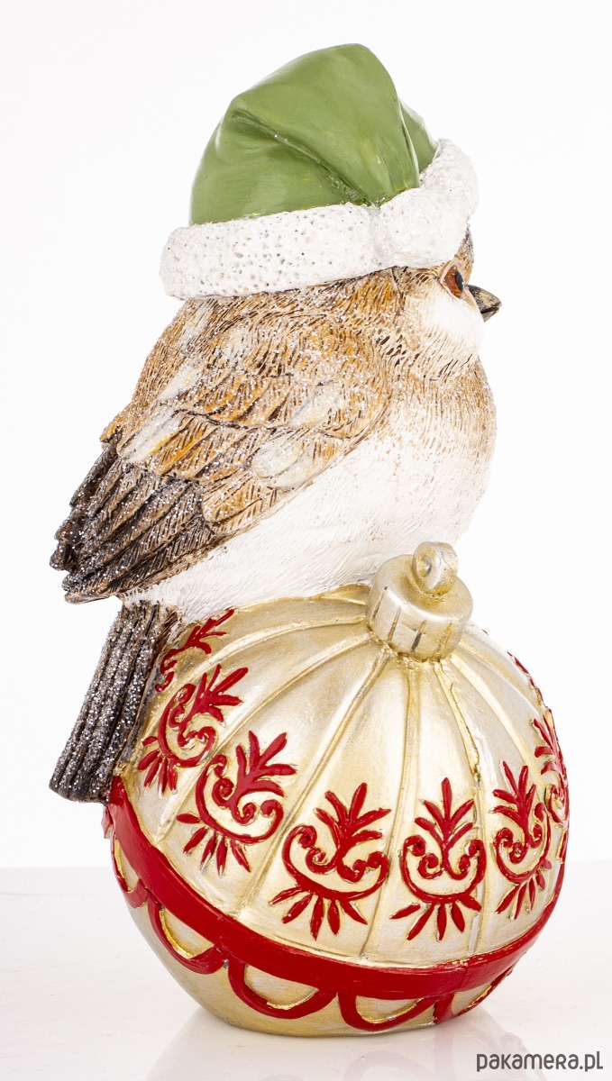 Wykonana z tworzywa sztucznego dekoracja świąteczna. Piękna bombka, a na niej siedzi ptaszek w zimowej czapeczce. Będzie niezwykłą ozdobą choinki.