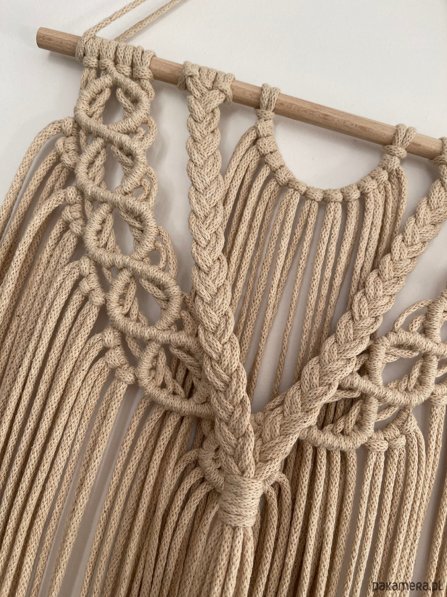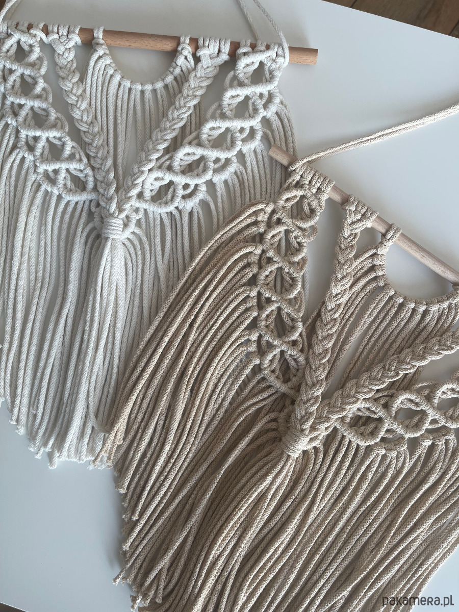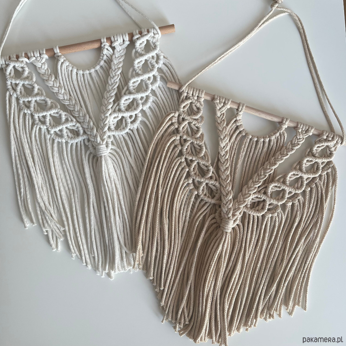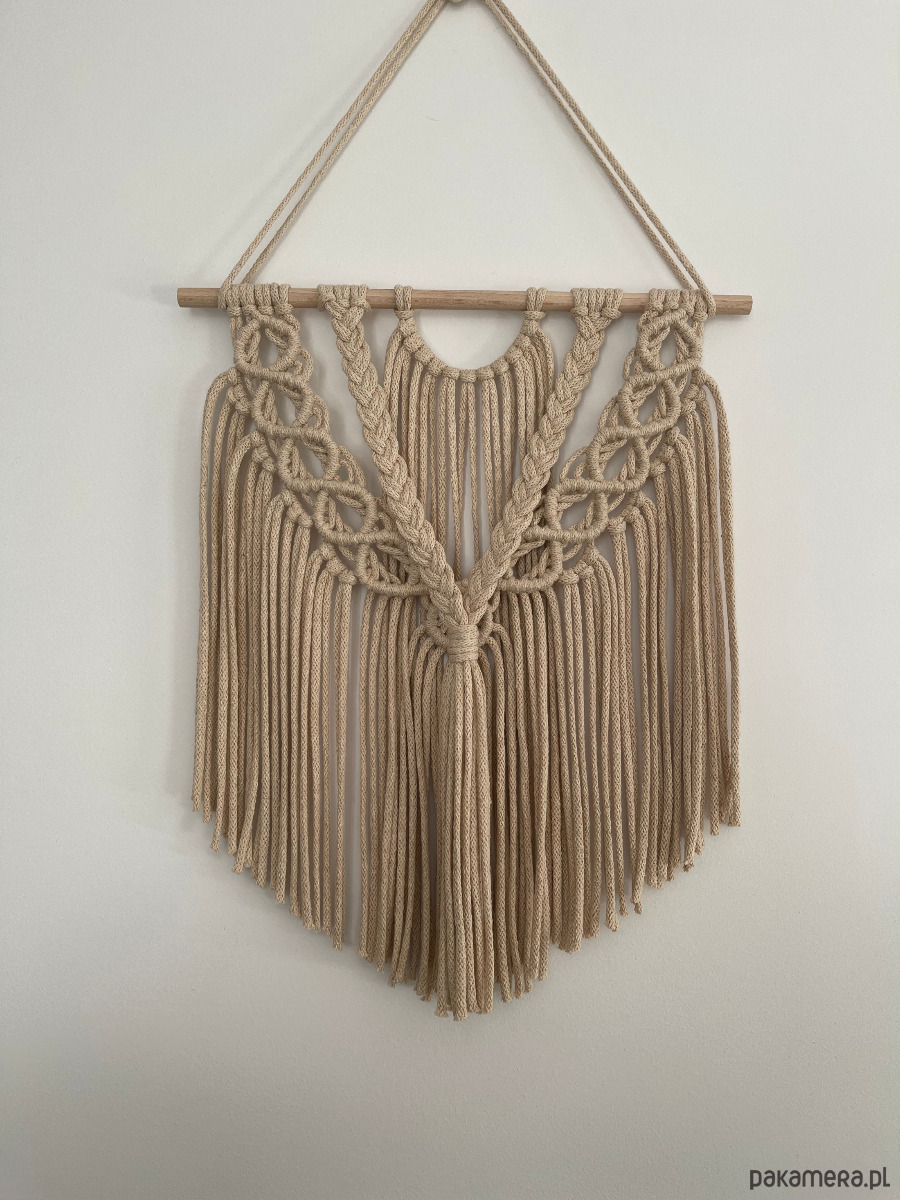 Ręcznie wykonana makrama – dekoracja ścienna to stylowy dodatek do wnętrz w stylu boho i naturalnym. Wykonana ze sznurka 3 mm, zachwyca starannym splotem i estetycznym wykończeniem. Wymiary makramy to 30 cm szerokości i 37 cm długości, dzięki czemu idealnie sprawdzi się jako subtelna ozdoba ściany. Dostępne kolory to ecru, beżowy, brązowy oraz czarny. Istnieje możliwość wykonania dekoracji w innym kolorze po wcześniejszym kontakcie w wiadomości prywatnej.