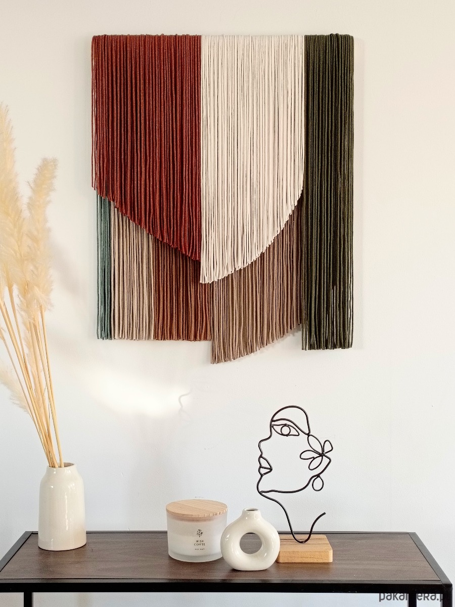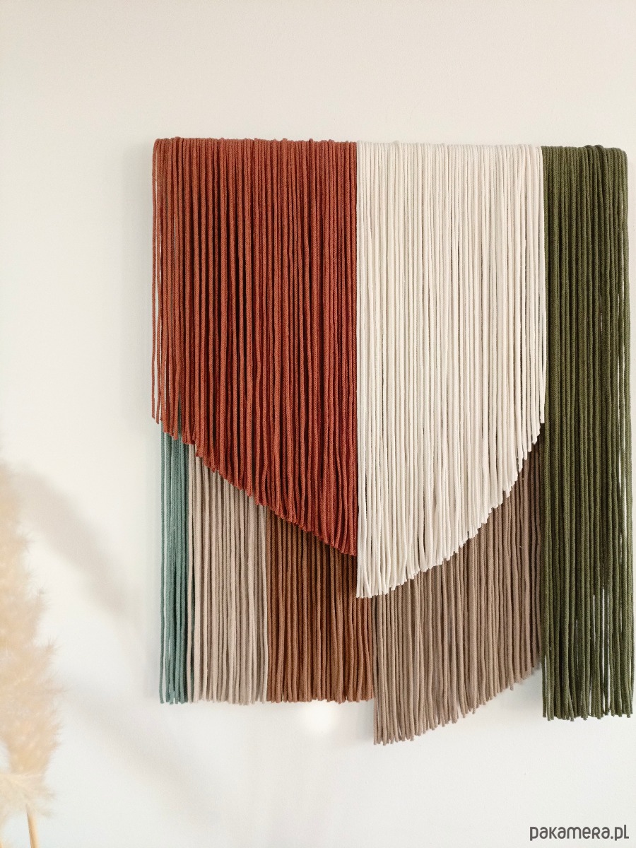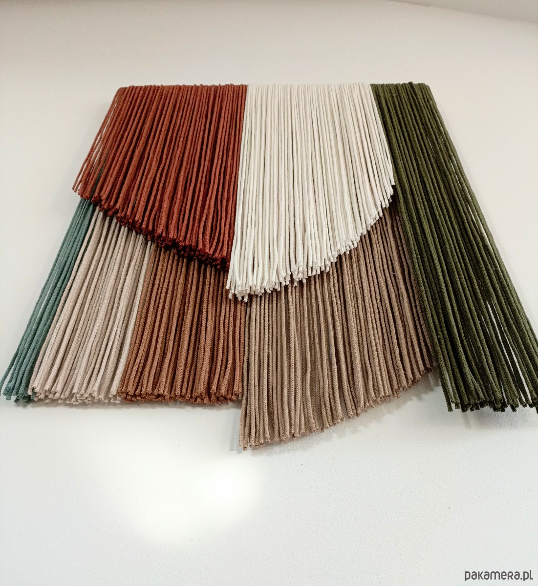 Dekoracja łączy różne odcienie sznurków, takie jak ciepły brąz, kremowy, zieleń i beż, sunset tworząc harmonijną całość. Sznurki zostały starannie ułożone w formy geometryczne, co nadaje dziełu nowoczesny i artystyczny charakter.