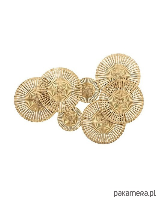 Dekoracja ścienna w całości wykonana z metalu. Przestrzenna. W kształcie połączonych kół i kółek. Lekko postarzana.