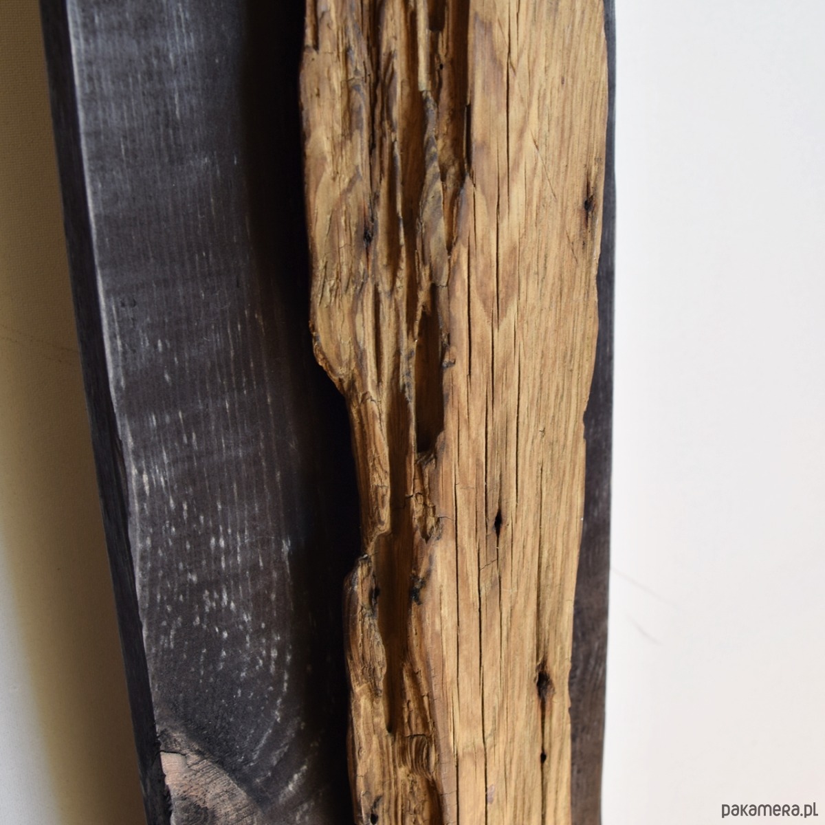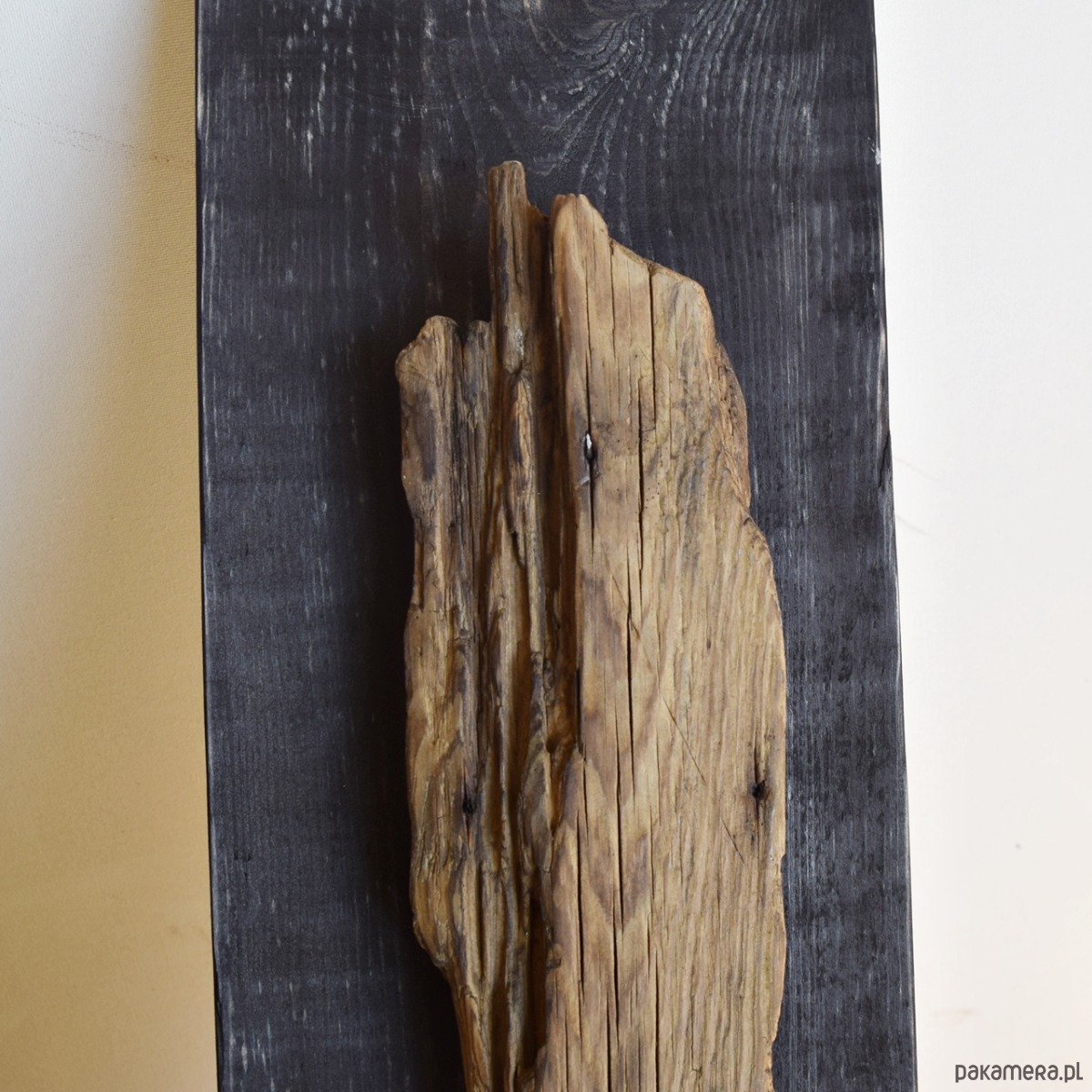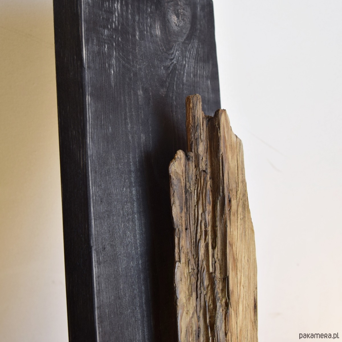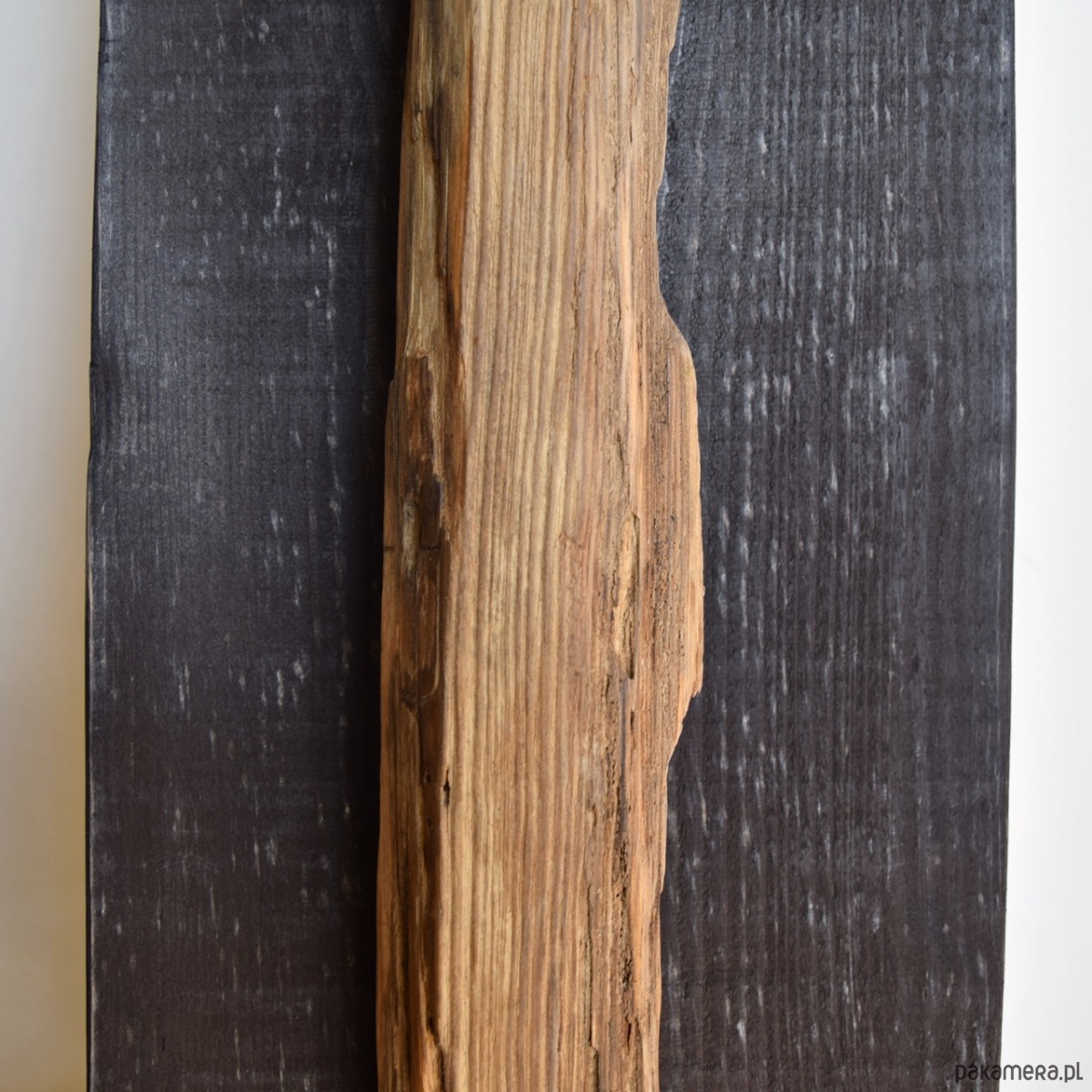 Dekoracja ścienna wykonana z desek sosnowych oraz starego drewna - są to stare deski, które zostały uratowane przed spaleniem, jedna z nich wyrzucona przez morze i znaleziona na bałtyckiej plaży. Celowo pozostawione nierówności, pęknięcia i otwory po gwoździach podkreślają ich historię i unikalność, nawiązują również do stylu wabi-sabi. Sosnowe deski "bazowe" pokryte są czarną bejcą (złamana, brunatna czerń wpadająca w bardzo ciemny brąz), natomiast stare deski są oczyszczone i pokryte werniksem, który daje podstawową ochronę jednocześnie zachowuje jak najbardziej naturalny, matowy wygląd starego drewna.