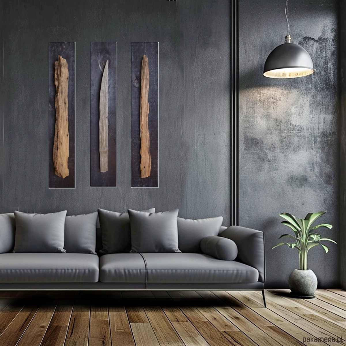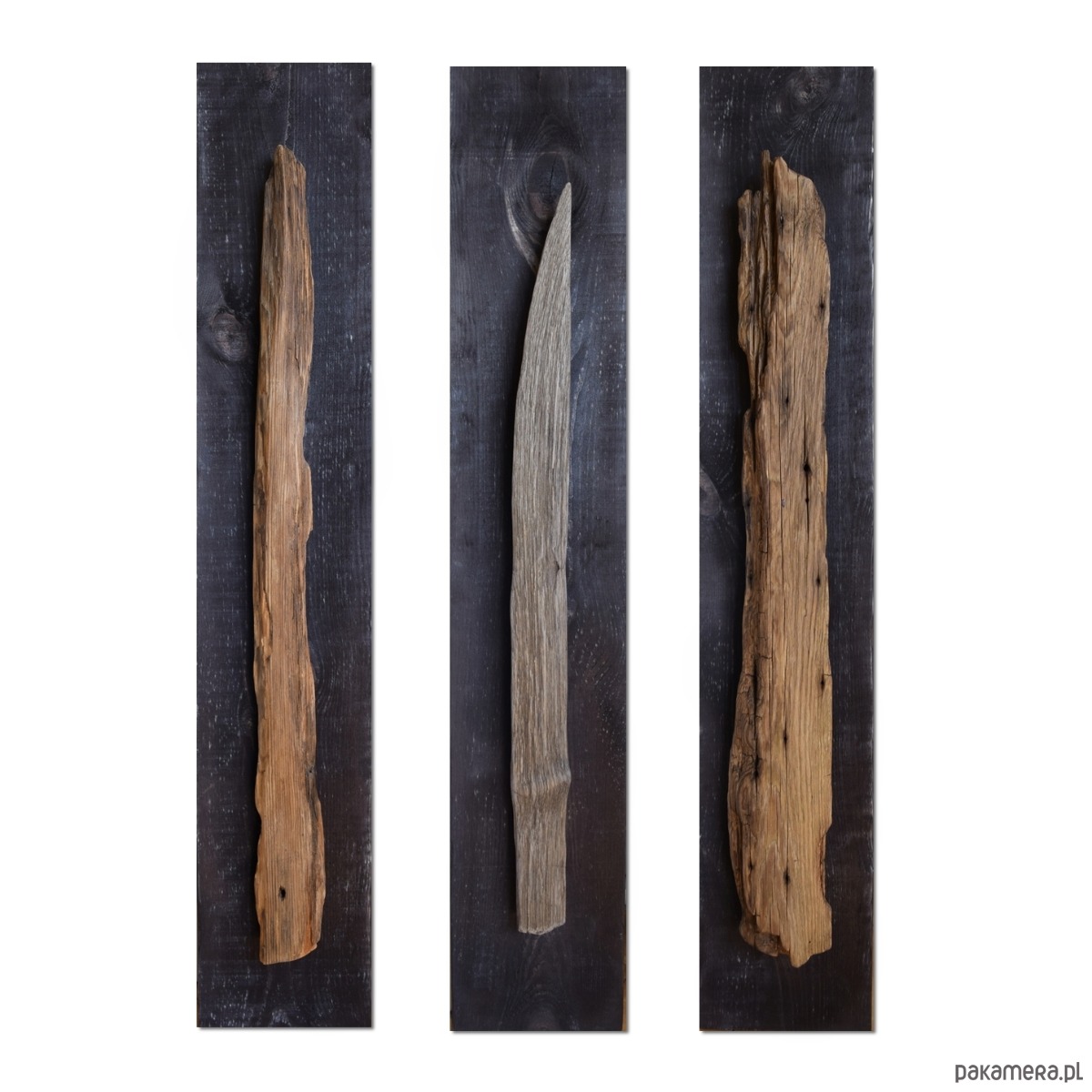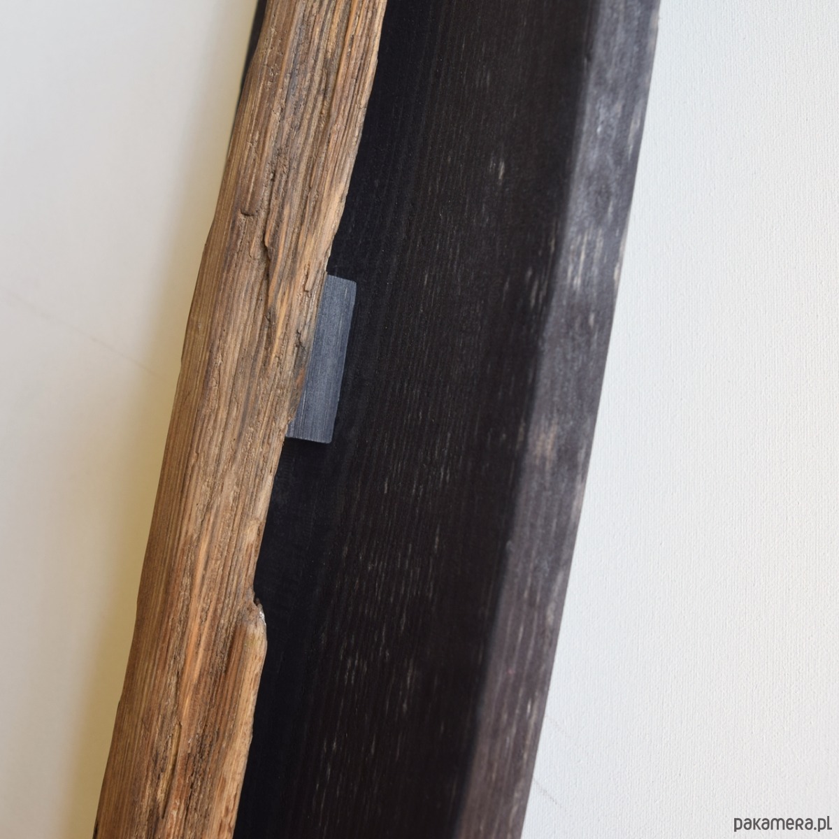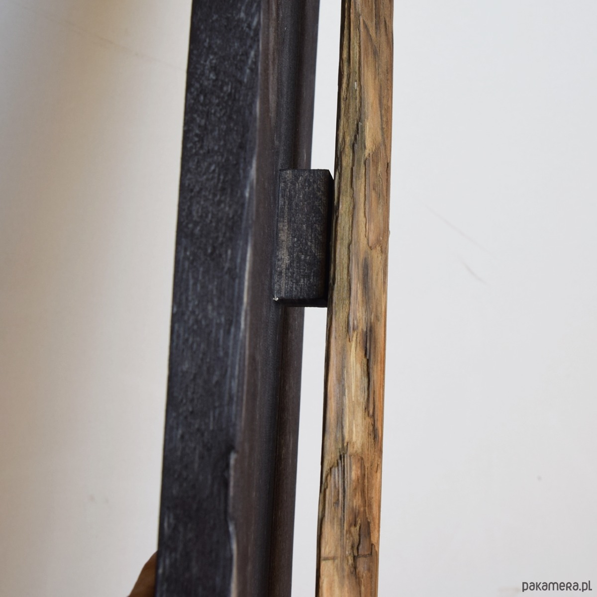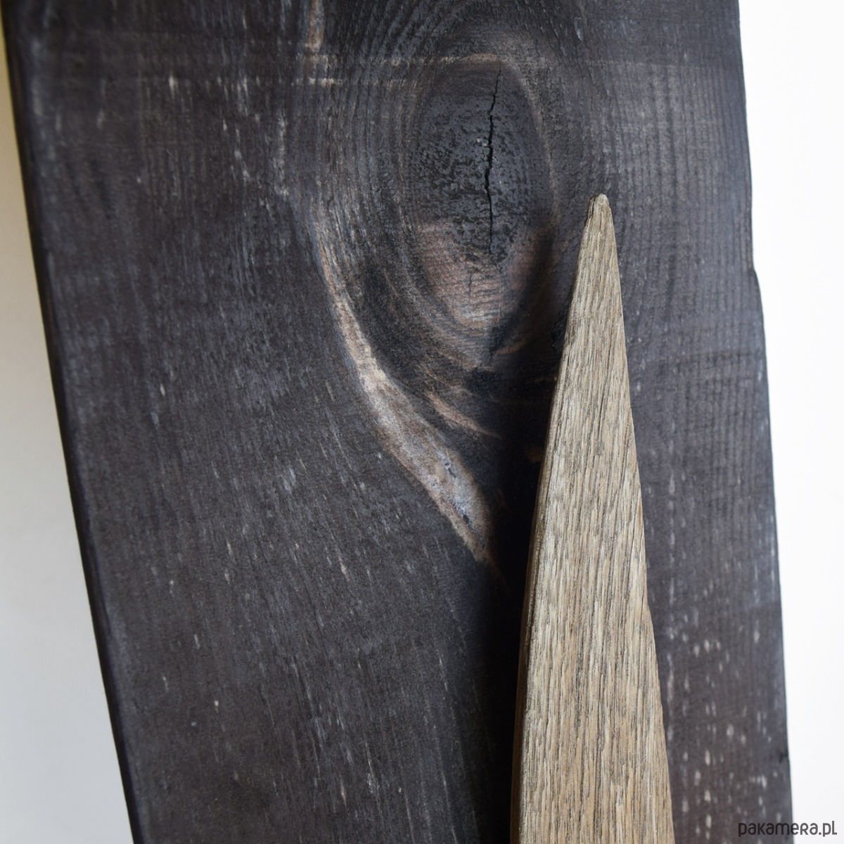 Dekoracja ścienna wykonana z desek sosnowych oraz starego drewna - są to stare deski, które zostały uratowane przed spaleniem, jedna z nich wyrzucona przez morze i znaleziona na bałtyckiej plaży. Celowo pozostawione nierówności, pęknięcia i otwory po gwoździach podkreślają ich historię i unikalność, nawiązują również do stylu wabi-sabi. Sosnowe deski "bazowe" pokryte są czarną bejcą (złamana, brunatna czerń wpadająca w bardzo ciemny brąz), natomiast stare deski są oczyszczone i pokryte werniksem, który daje podstawową ochronę jednocześnie zachowuje jak najbardziej naturalny, matowy wygląd starego drewna.