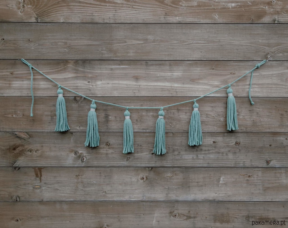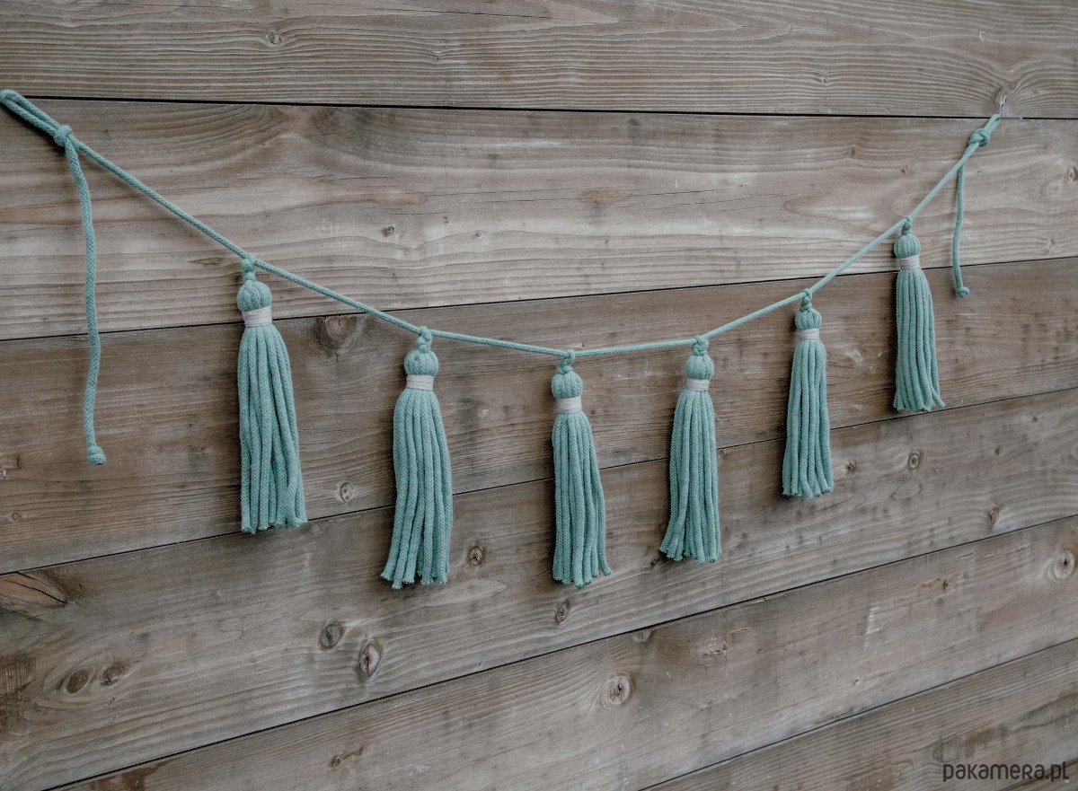 Girlanda z 6 chwostow w kolorze zielomym .. Długość z chwostami okolo 60cm ale można przesunąć chwosty i mieć szersza.. (całkowita długość sznurka okolo 140cm).. Można zawiesic na kominku.. W pokoju dziecka.. W przedpokoju lub salonie.. Piękny akcent świąteczny..