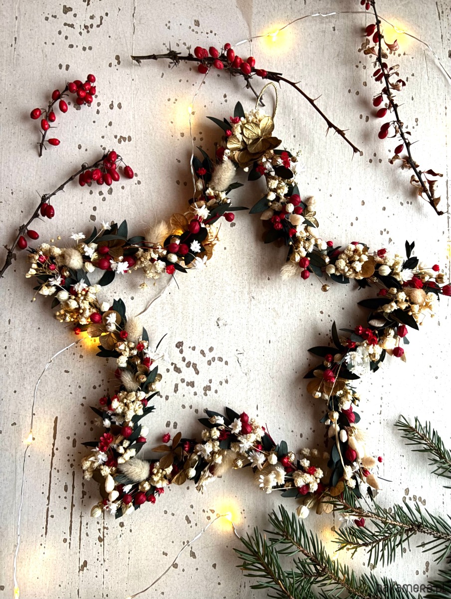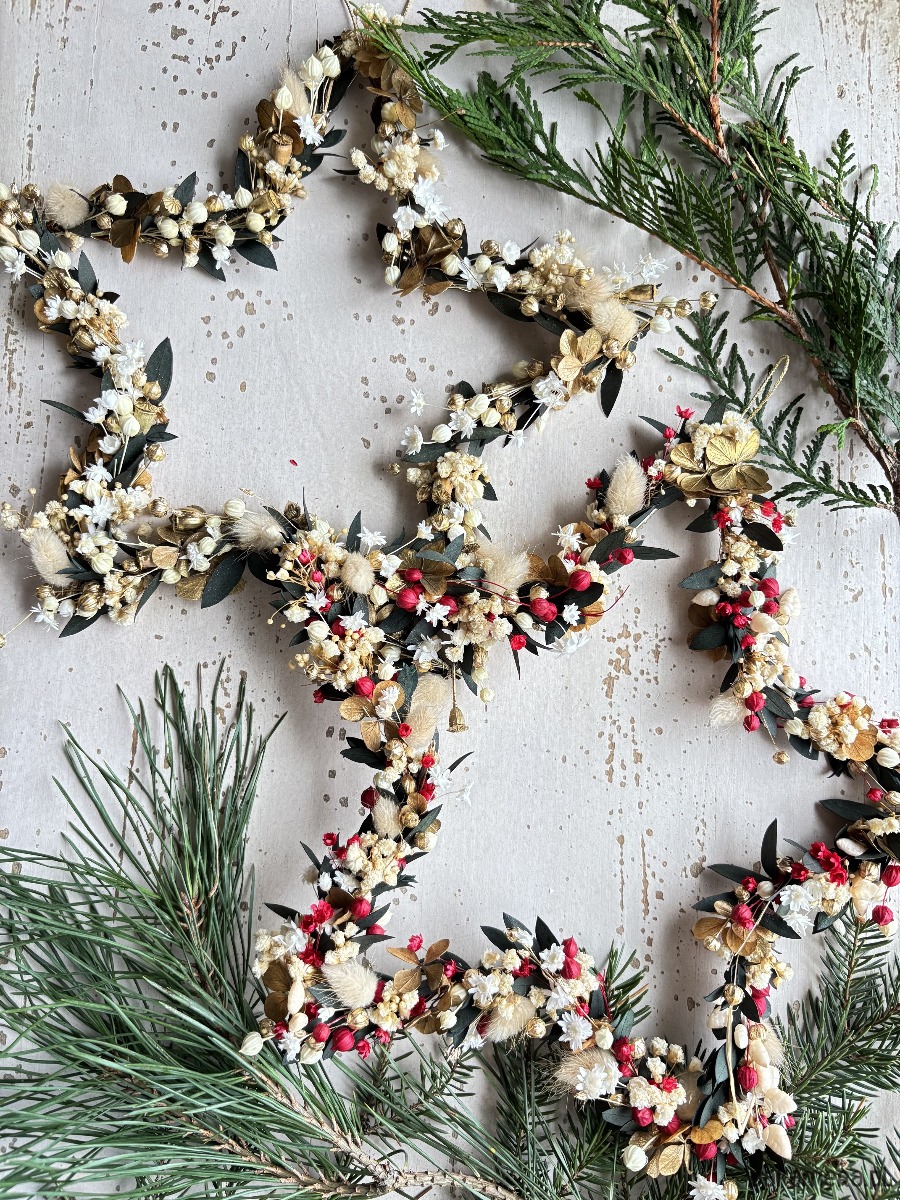 Świąteczna gwiazda wykonana jest z cudownie pachnącego stabilizowanego eukaliptusa, lnu, hortensji, dmuszka i innych suszonych kwiatów.