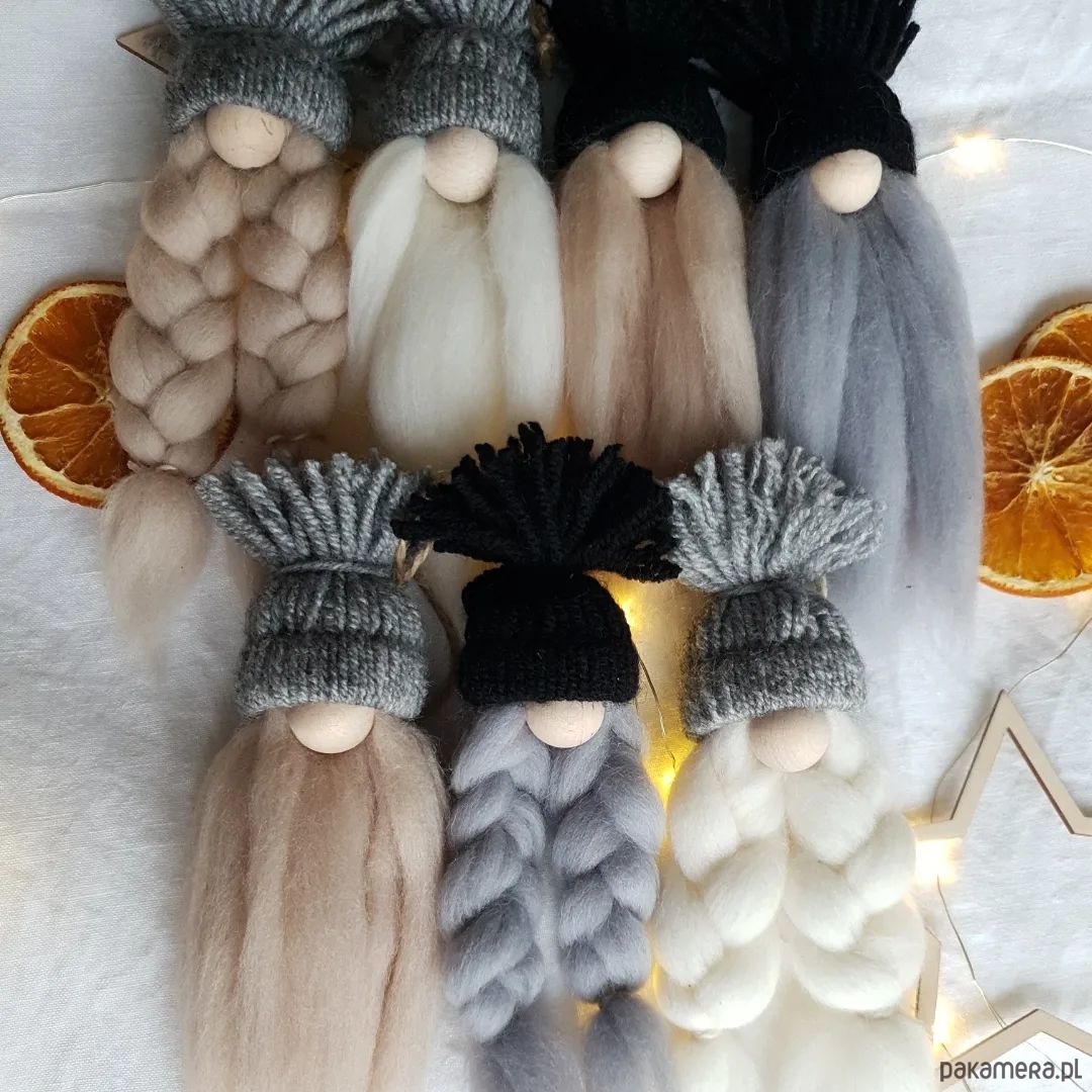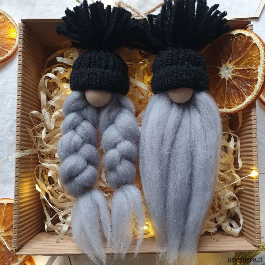 Prezentowany na zdjęciu zestaw dwóch krasnali to ręcznie robione zawieszki, które można powiesić na choince jako bombki lub w dowolnym miejscu w mieszkaniu jako samodzielną ozdobę.