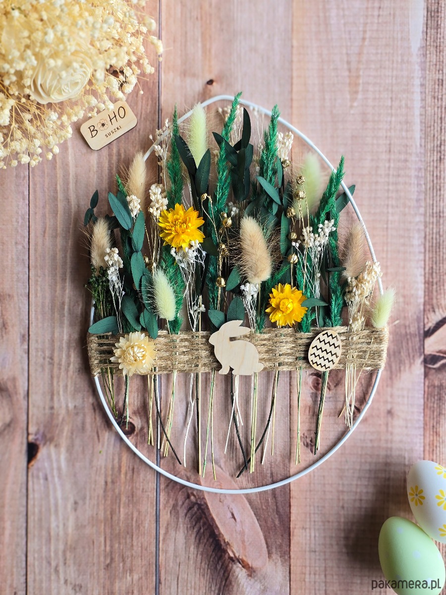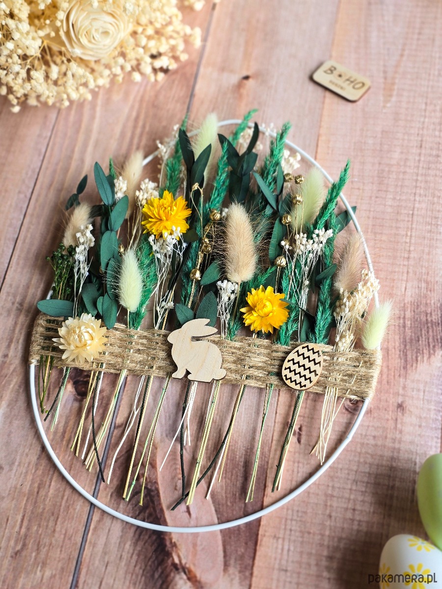 Wielkanocna kwiecista obręcz doskonale prezentuje się na ścianie, drzwiach lub w oknie. To także świetny pomysł na prezent dla kogoś, kto kocha naturę i unikatowe dekoracje.