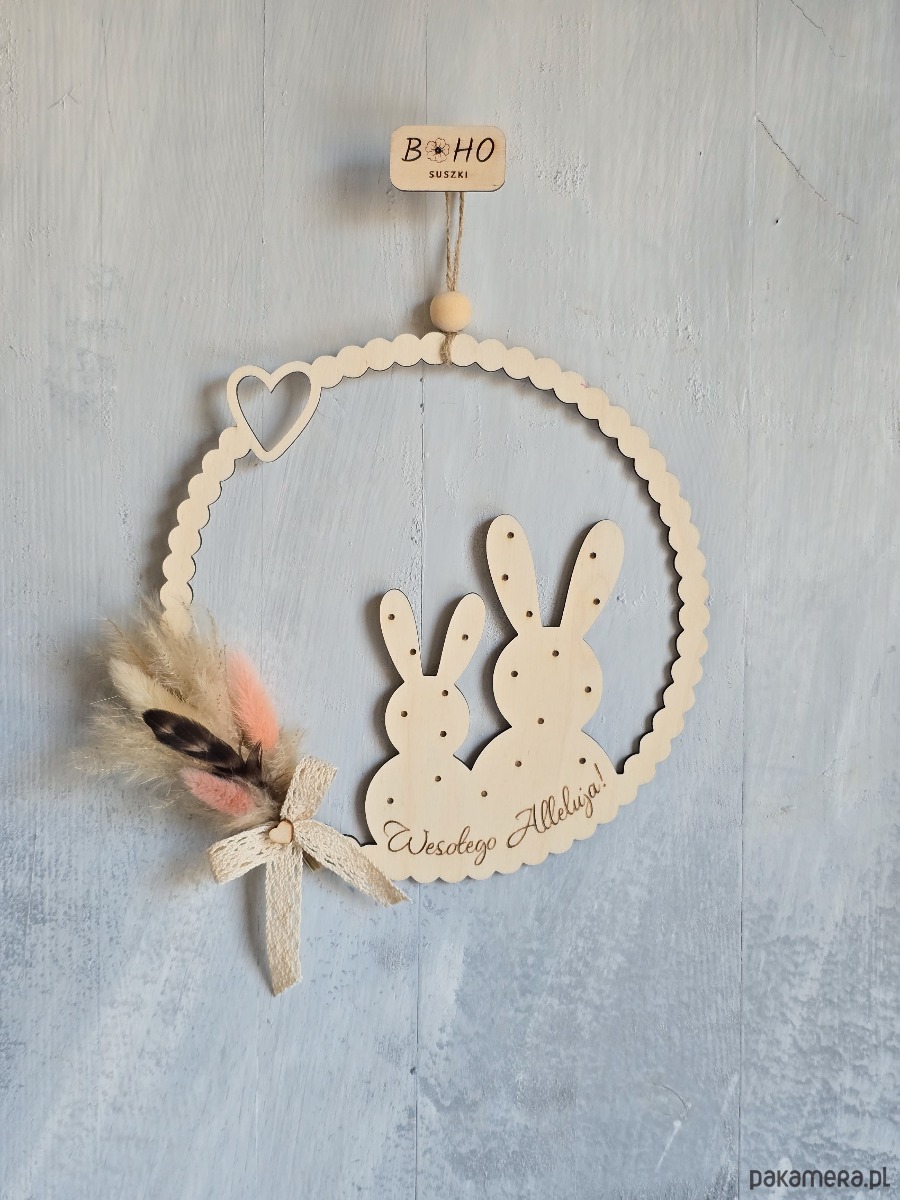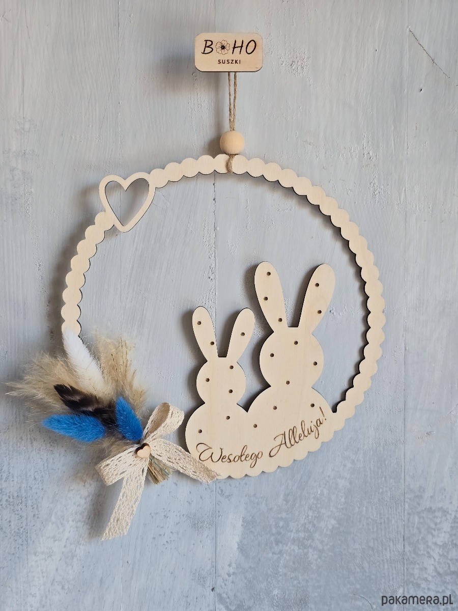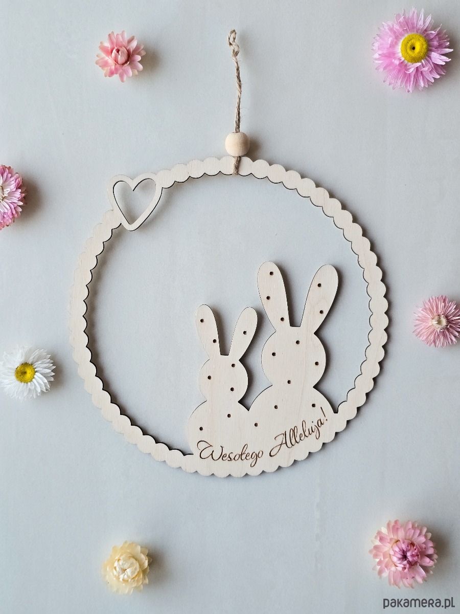 To dekoracja, która subtelnie podkreśla wielkanocny charakter wnętrza. Wykonany ze sklejki z wygrawerowanym napisem "Wesołego Alleluja!", ozdobiony suszonymi kwiatami. Sprawdzi się jako dekoracja na Wielkanoc dla osób ceniących estetykę i spokój we wnętrzu.