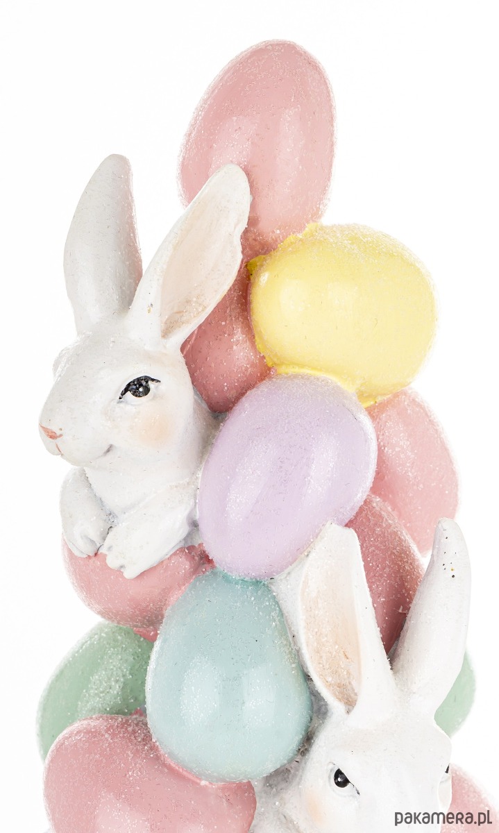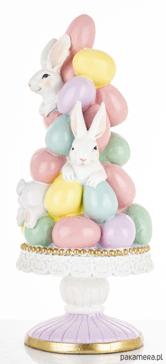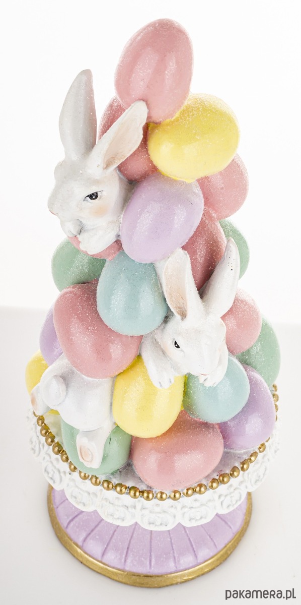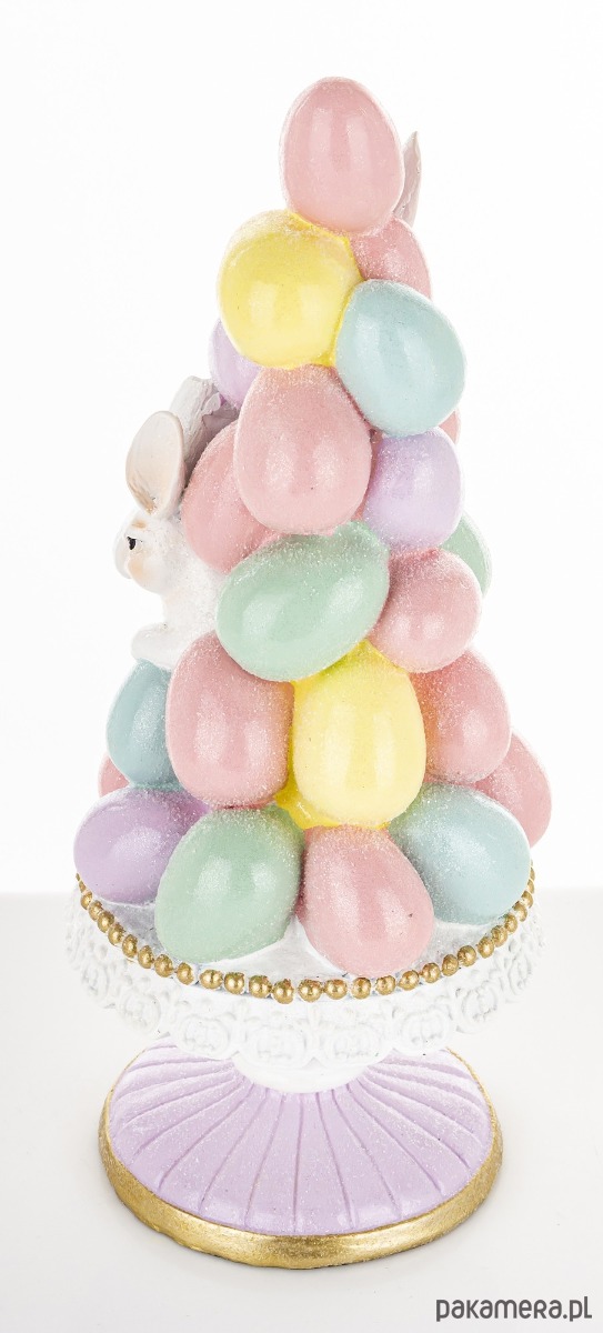 Wykonana z tworzywa sztucznego piramida wielkanocna. Barwne pisanki stoją na sobie, tworząc wysoką wieżę. Elegancka patera ze złoconym brzegiem jest podstawą. Między jajeczkami ukrywają się białe króliczki. Urocza dekoracja świąteczna.