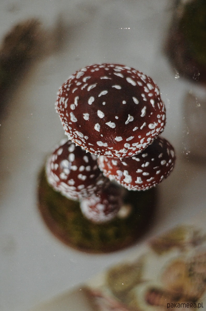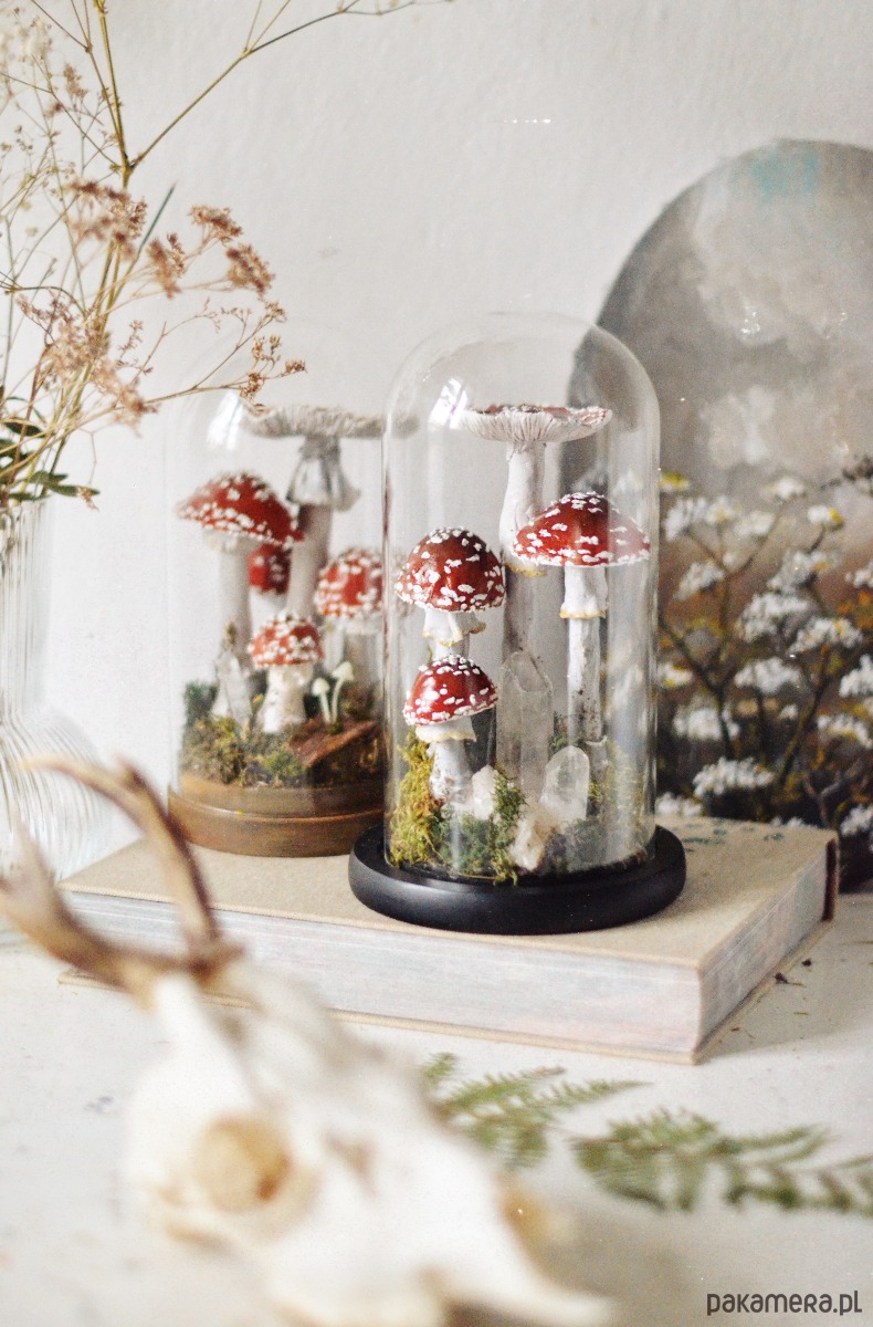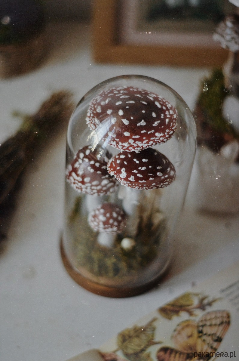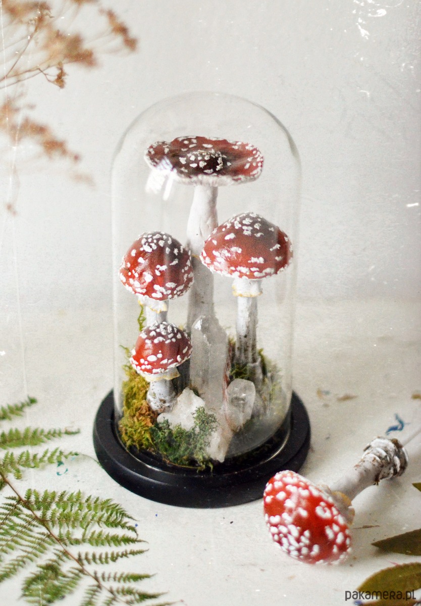 Dekoracja z grzybami - szklany klosz kopułka z muchomorami