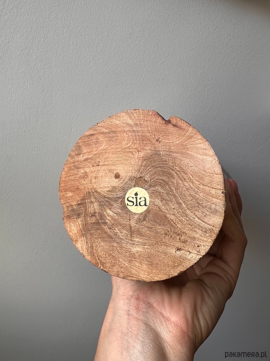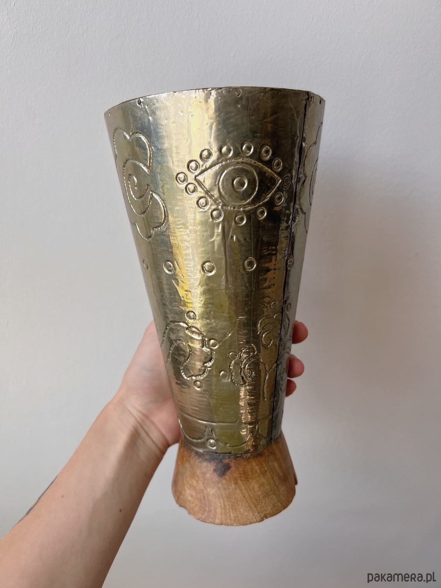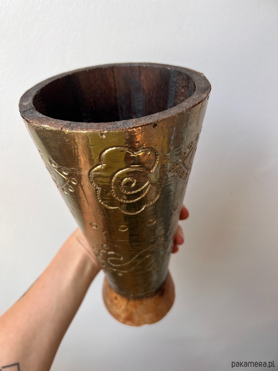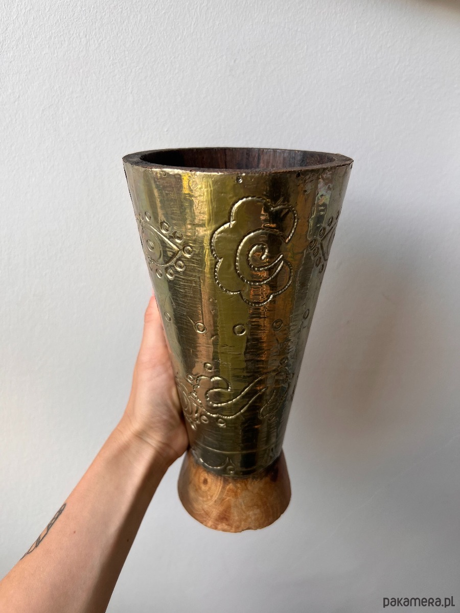 Dziwna, ale moim zdaniem bardzo efektowna rzecz. Rodzaj wazonu z drewna z metalowym okuciem i ciekawymi wzorami. Kolor metalu pomiędzy srebrem i złotem, także w zależności od padającego światła.