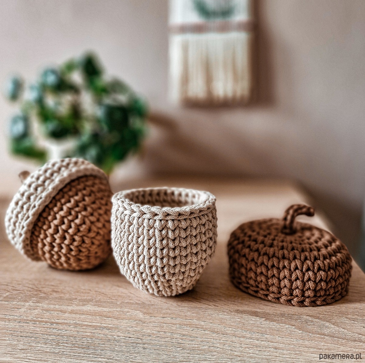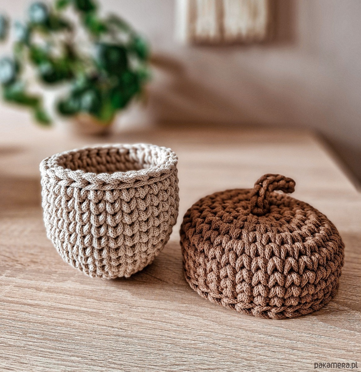 Koszyczki – dekoracje jesienne w formie żołędzi świetnie sprawdzą się zarówno w pokoju dziecięcym jak i w przedpokoju jako schowek na drobiazgi. Wieczka koszyków przypominają żołędziowe czapeczki z ogonkami, które ułatwiają ich otwieranie.