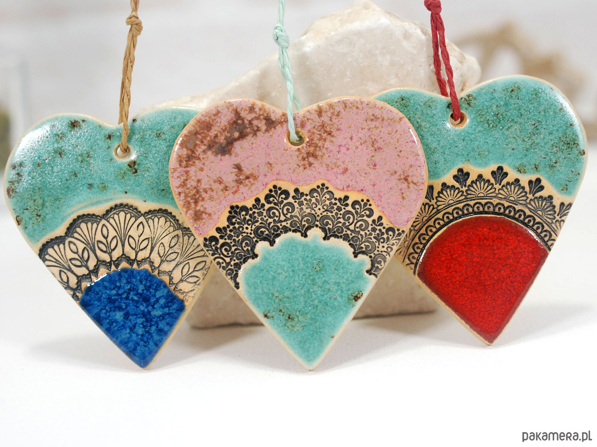 Ręcznie robiony komplet trzech ceramicznych serc zdobionych wzorem koronkowej mandali i nasyconymi kolorami: amarantem, błękitem oraz klasyczną czerwienią. Idealny upominek na nadchodzące Walentynki, urodziny czy rocznicę dla twoich najbliższych.