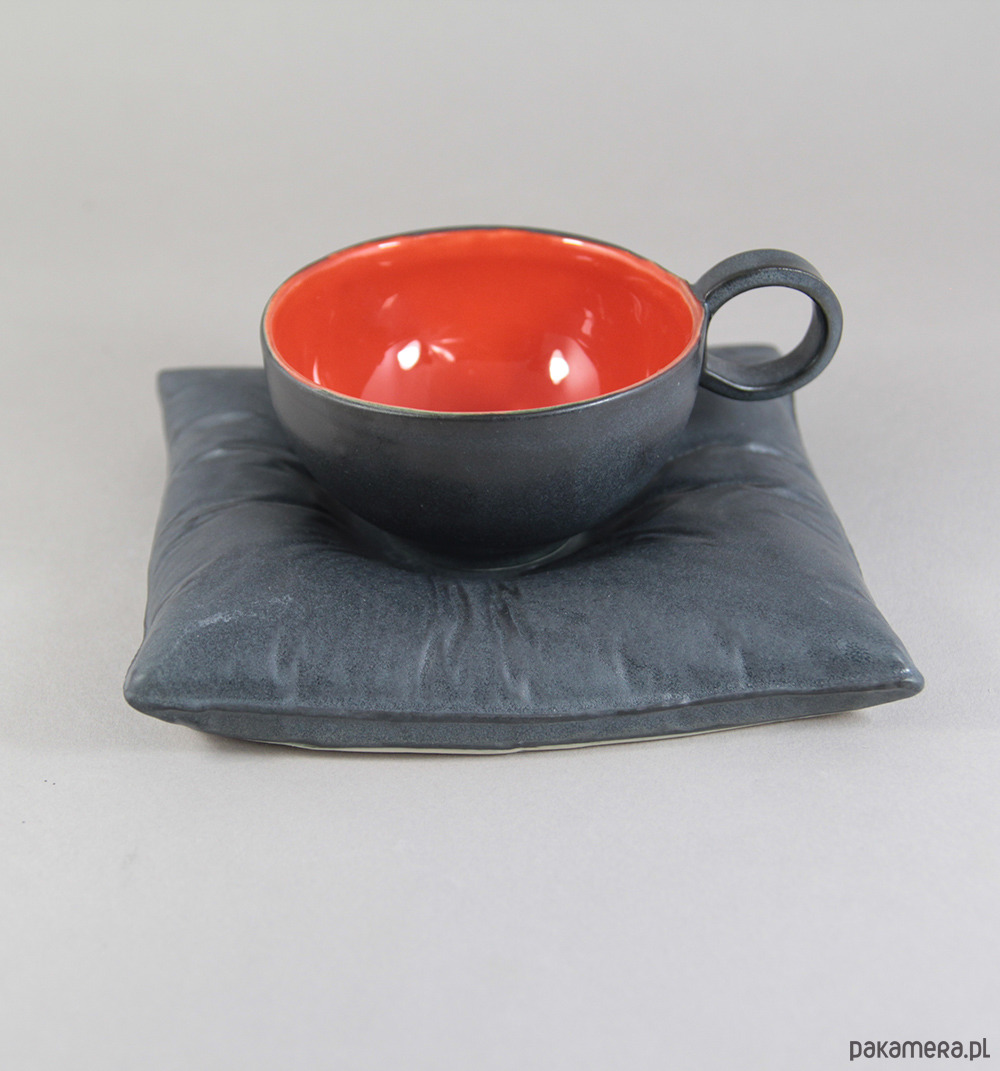 Filiżanka na podstawce w formie poduszki. Wykonana ręcznie z masy porcelitowej, szkliwiona w kolorze grafitowym. Wnętrze filiżanki szkliwione błyszczącą czerwienią. Wypalona w temperaturze 1250 C. Nadaje się do mycia w zmywarkach.
