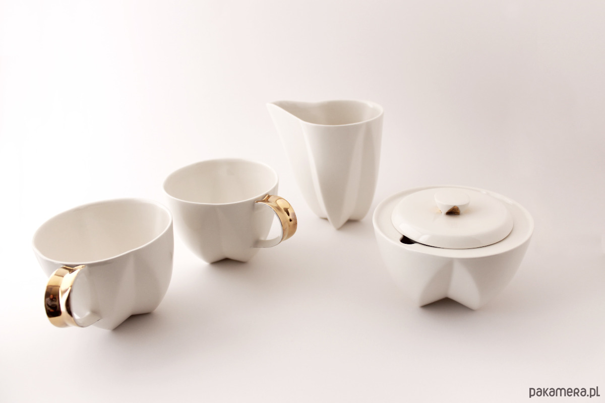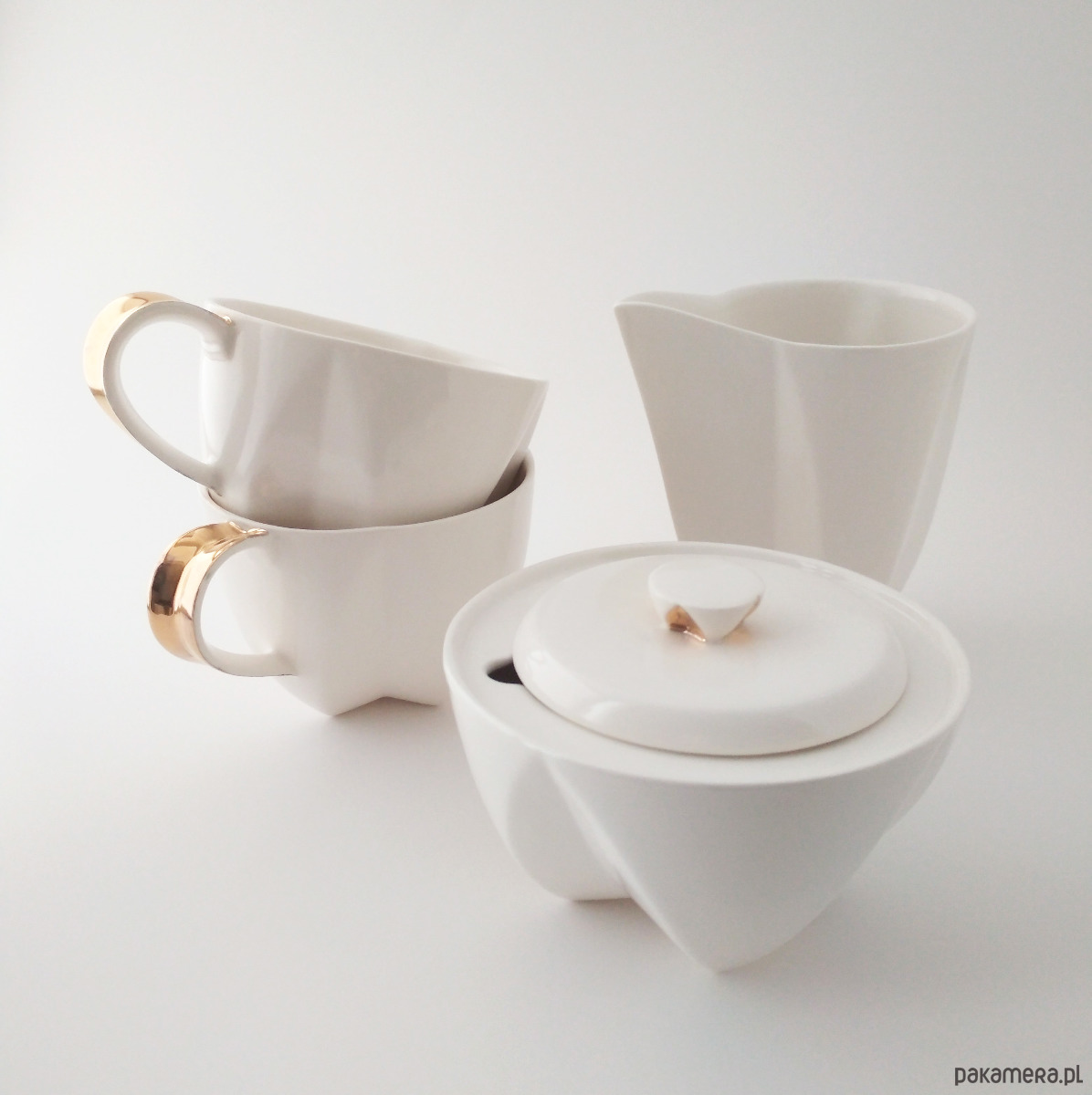 Dwie filiżanki, mlecznik i cukiernica ze złoconymi elementami