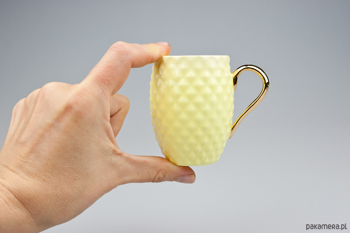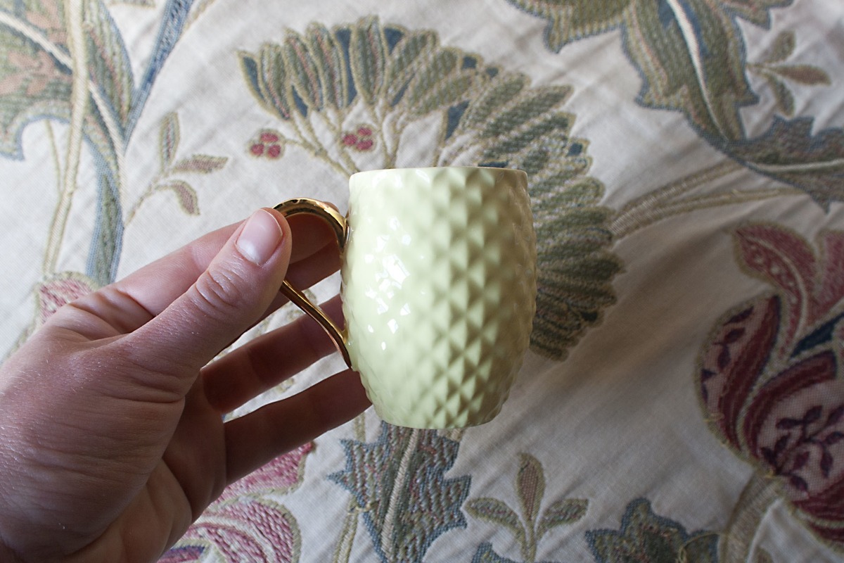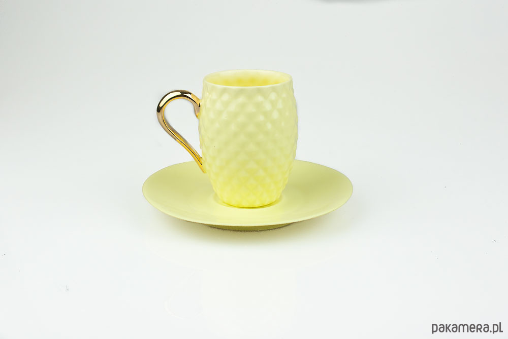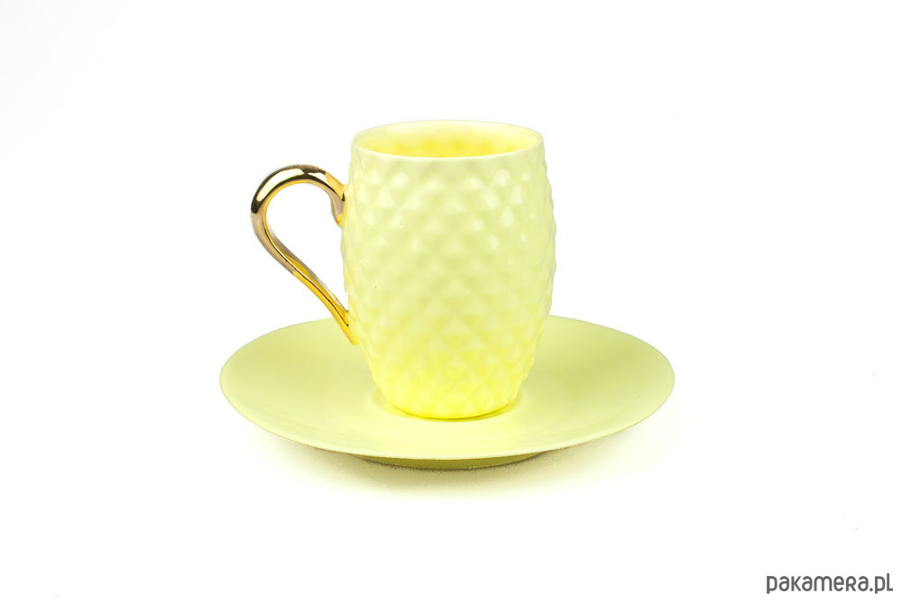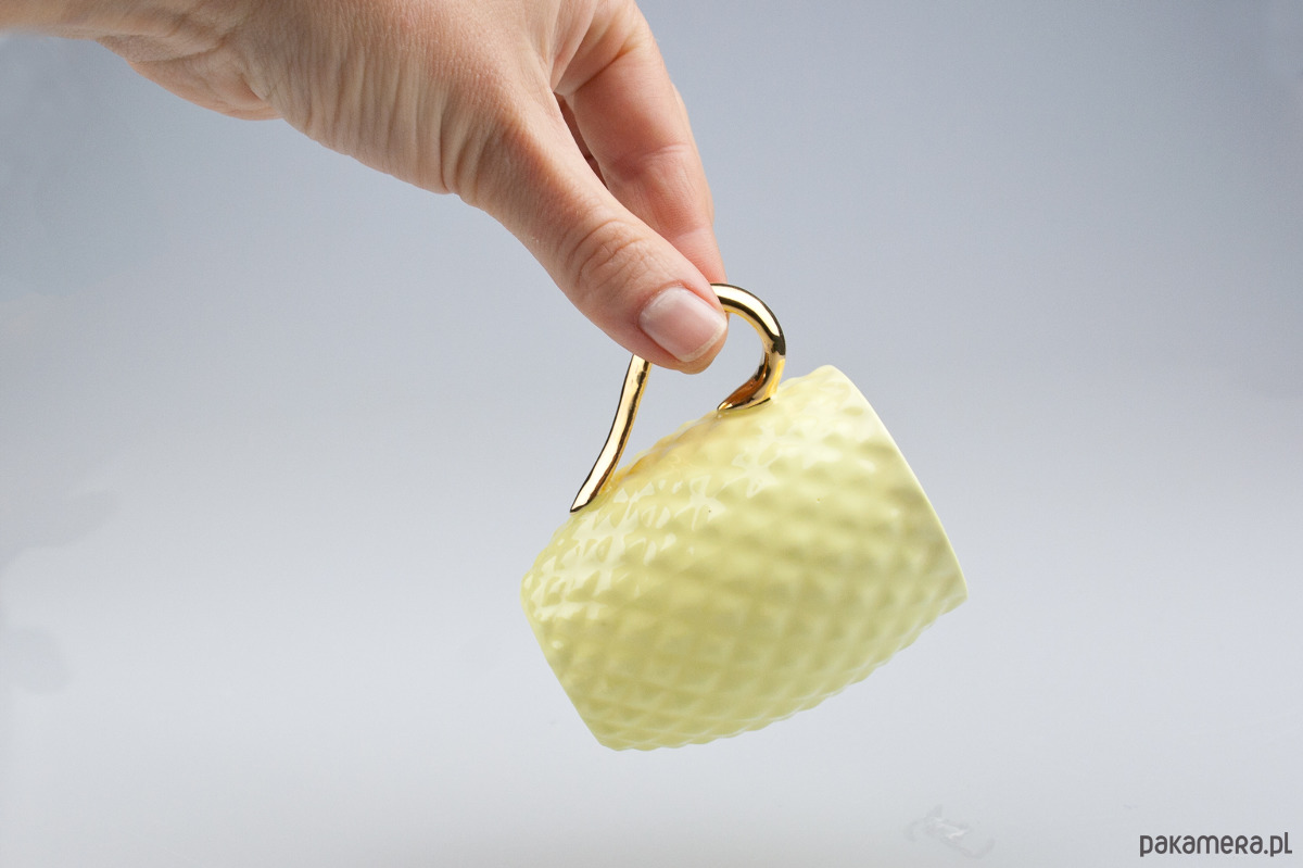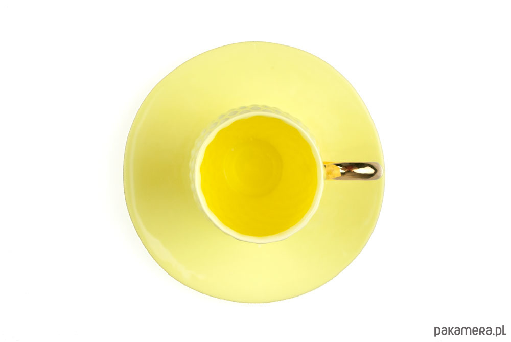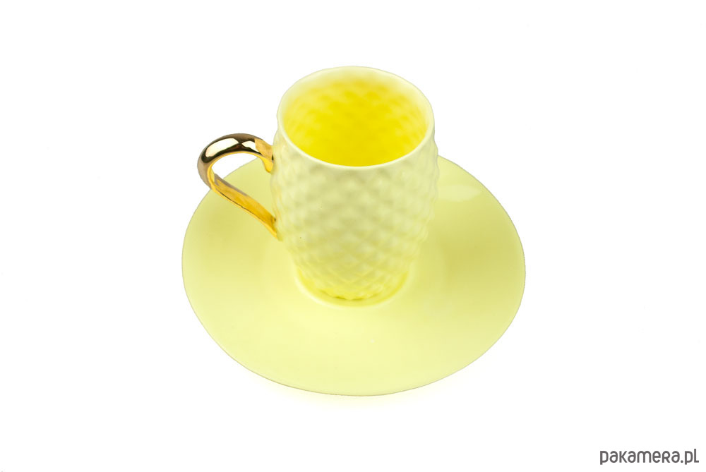 Wykonana ręcznie żółta filiżanka z porcelany bone china, ucho pokryte prawdziwym złotem.