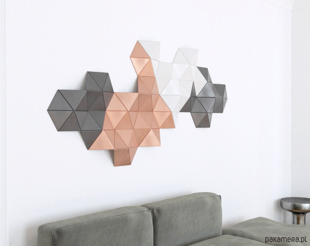Cell to przestrzenna dekoracja ścienna złożona z piętnastu sześciokątnych modułów. Kompozycję można zamontować wertykalnie lub horyzontalnie.