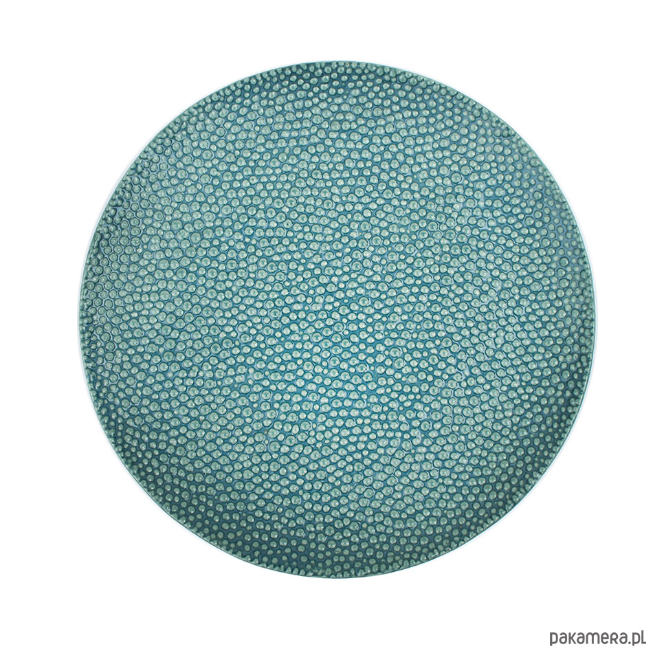 Efektowny ceramiczny talerz, ręcznie wykonany z jasnobeżowej masy kamionkowej, inspirowany motywami biologicznymi, obustronnie szkliwiony subtelnie błyszczącym błękitnozielonym szkliwem.Średnica ok 18cm Na zamówienie dostępny również w innych wersjach kolorystycznych. Szkliwo przeznaczone do kontaktu z żywnością