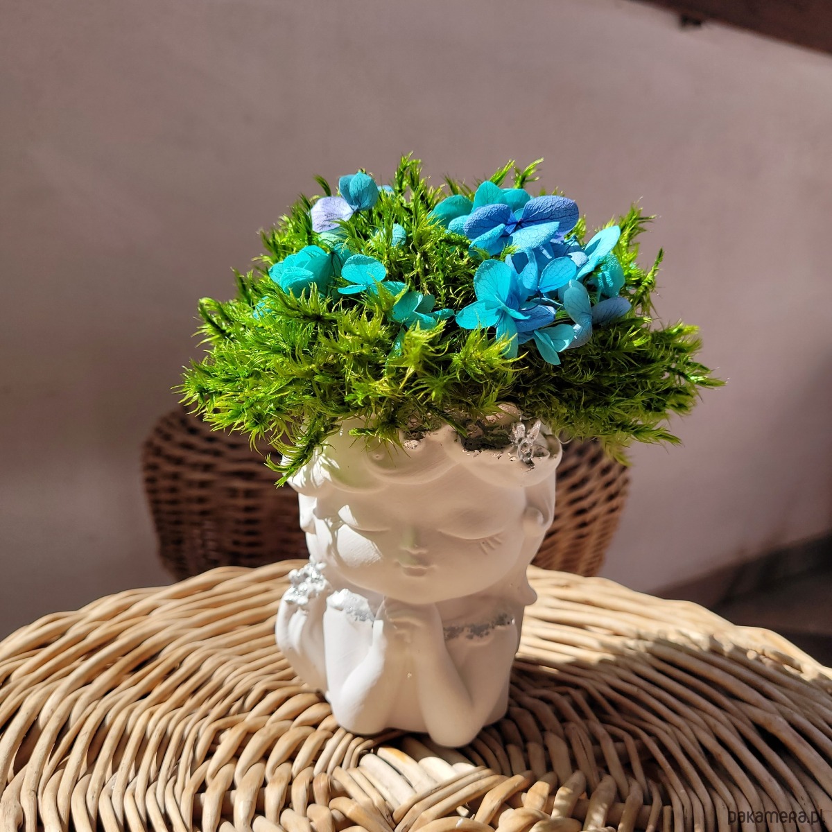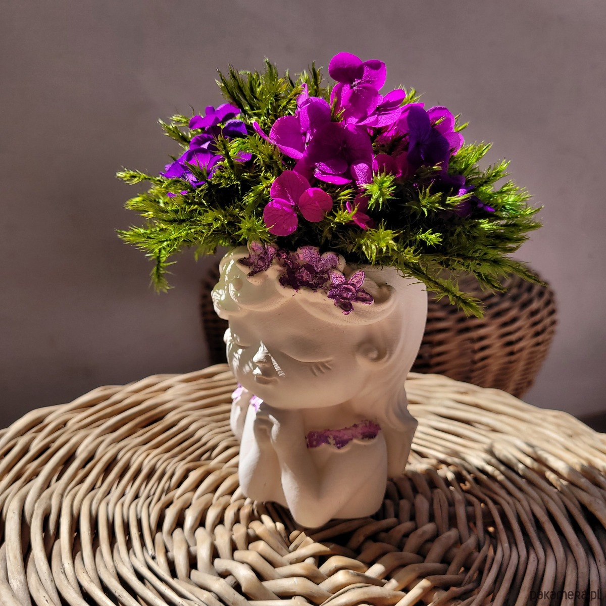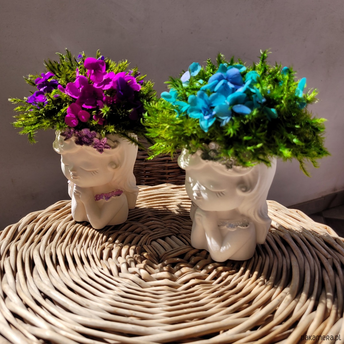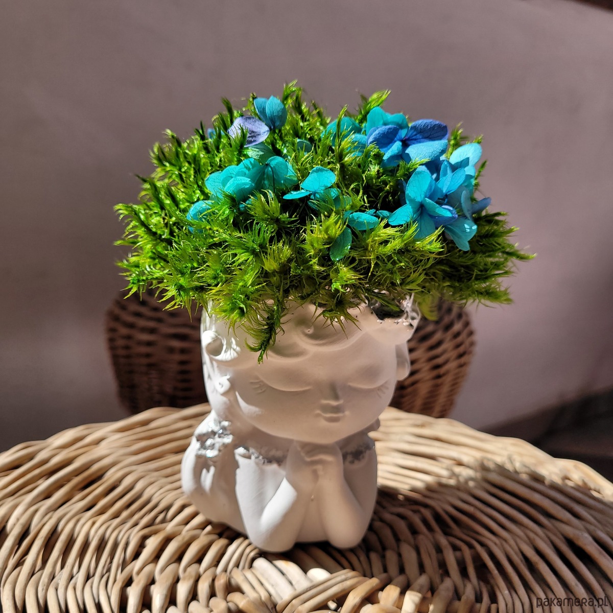 Dekoracyjna doniczka dziewczynka z mchem I kwiatami