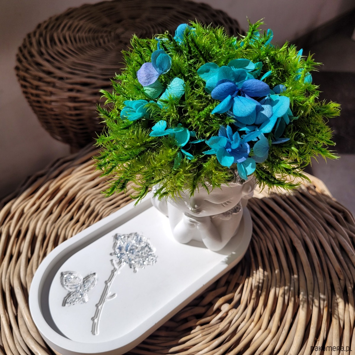 Ta subtelna kompozycja została stworzona przeze mnie z gipsu i ozdobiona delikatnymi akcentami srebra. Dziewczynka w zamyślonej pozie jakby marzyła, a jej fryzura zamieniła się w bukiet ze stabilizowanego mchu i suszonych kwiatów — nie wymagają pielęgnacji i zachowują świeżość przez długie lata.