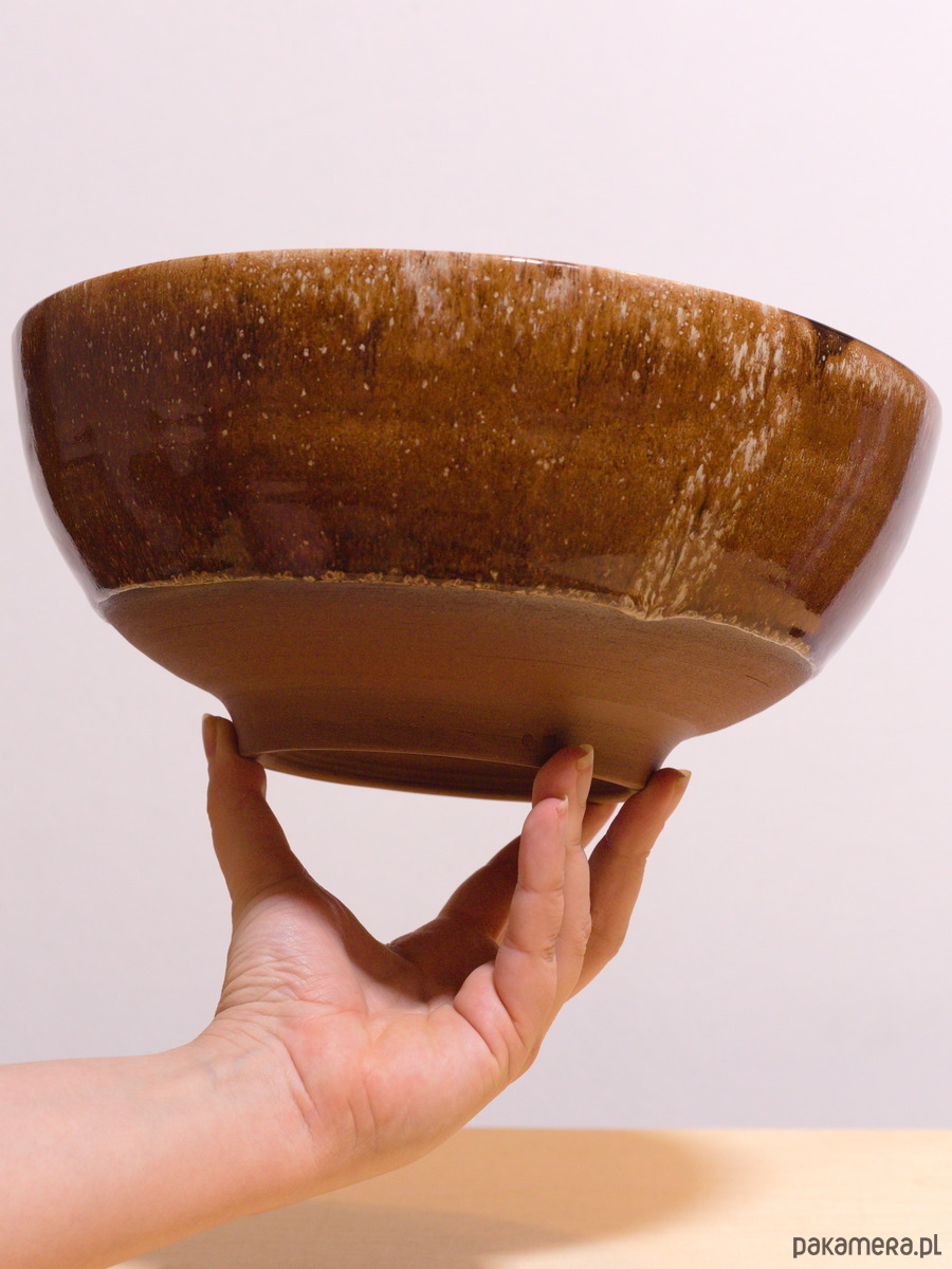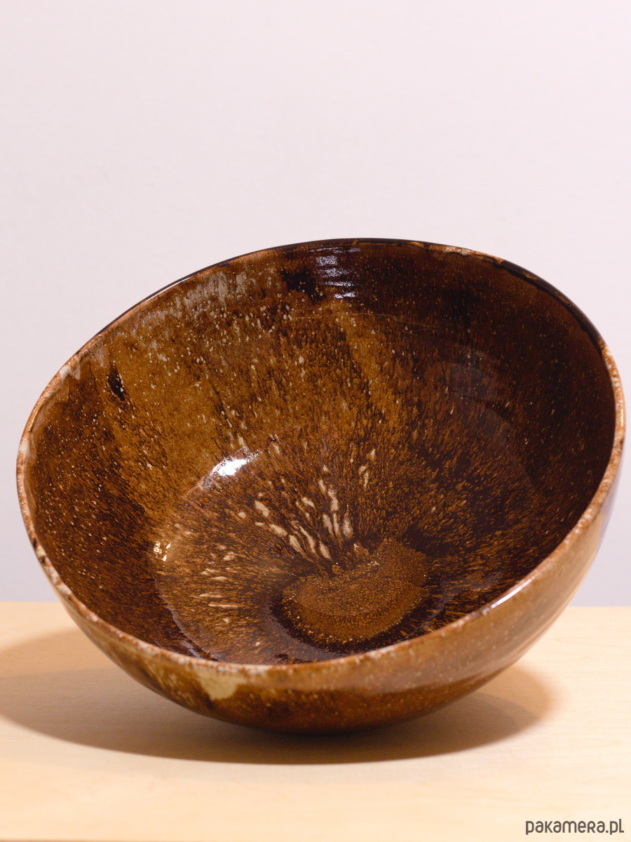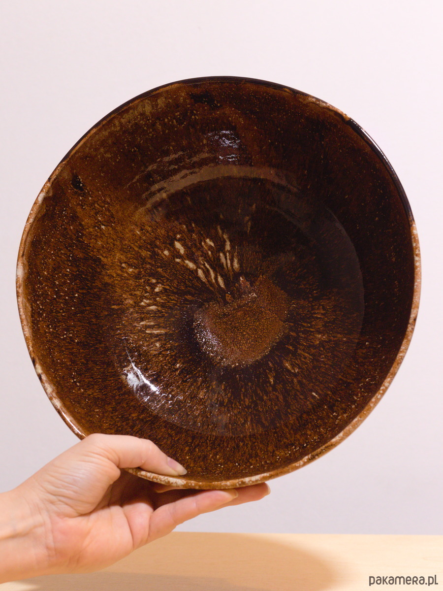 Miska jest szkliwiona na kolor Czekoladowy Deszcz - głęboki czekoladowy brąz z czarnymi i beżowymi kroplami. Powierzchnia szkliwa ma błyszczące wykończenie. Odsłonięta glina jest ciemno ruda.