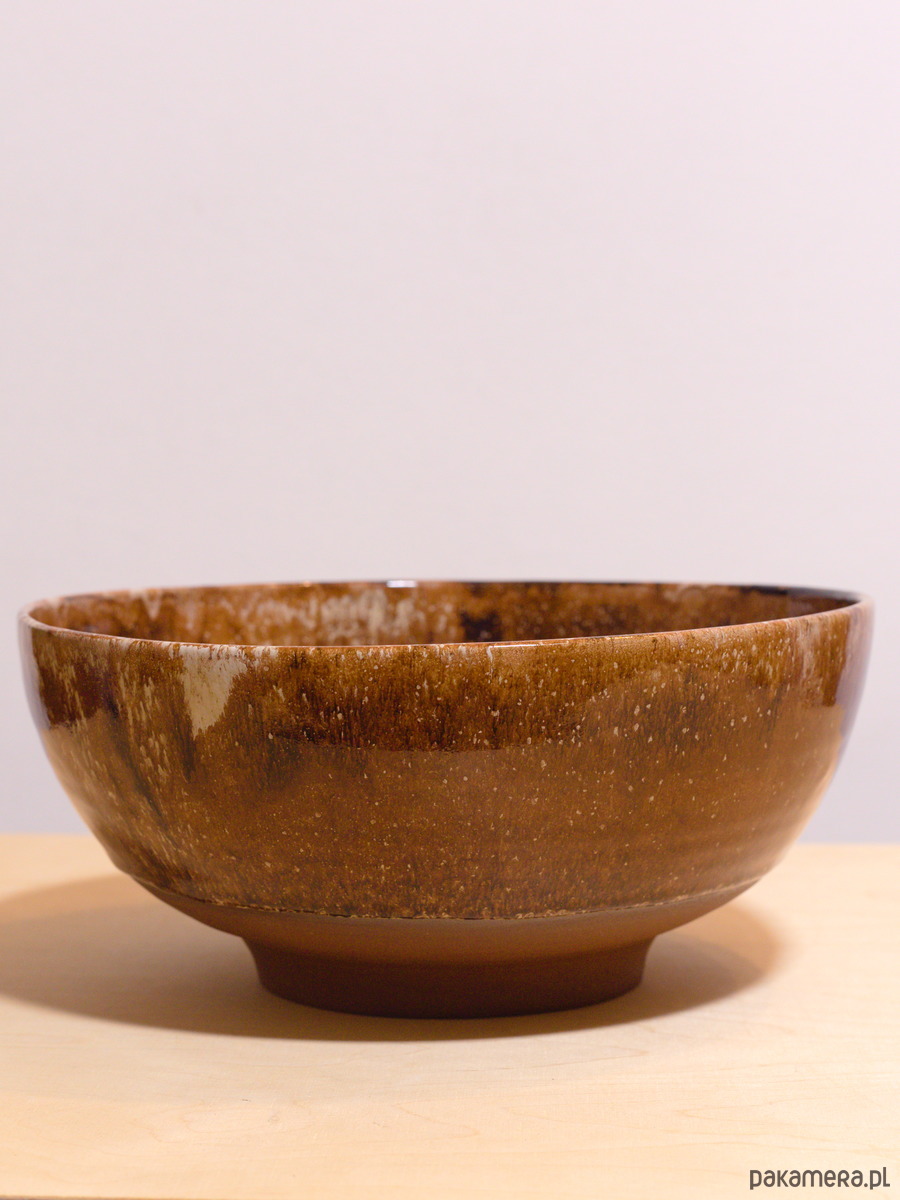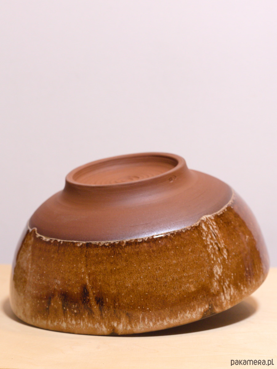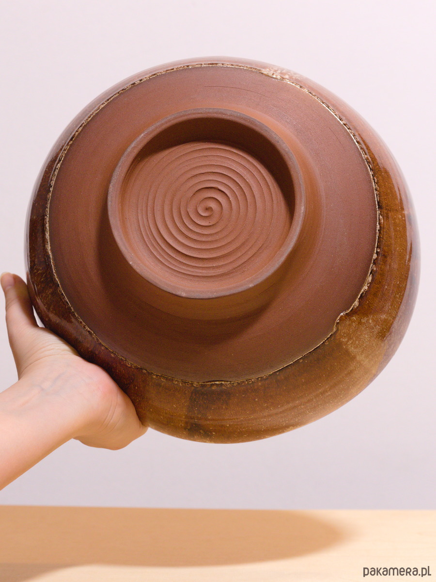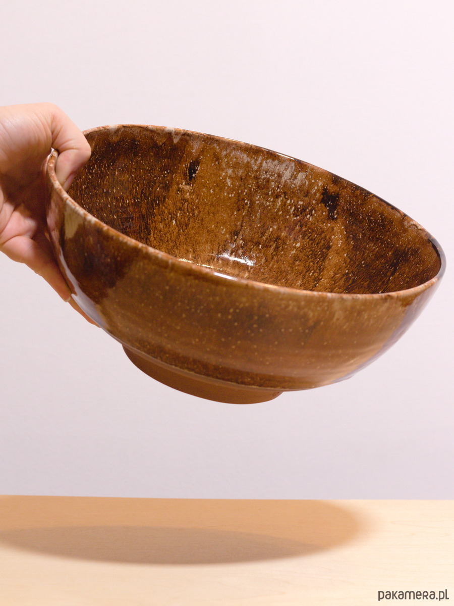 Miska jest szkliwiona na kolor Czekoladowy Deszcz - głęboki czekoladowy brąz z czarnymi i beżowymi kroplami. Powierzchnia szkliwa ma błyszczące wykończenie. Odsłonięta glina jest ciemno ruda.