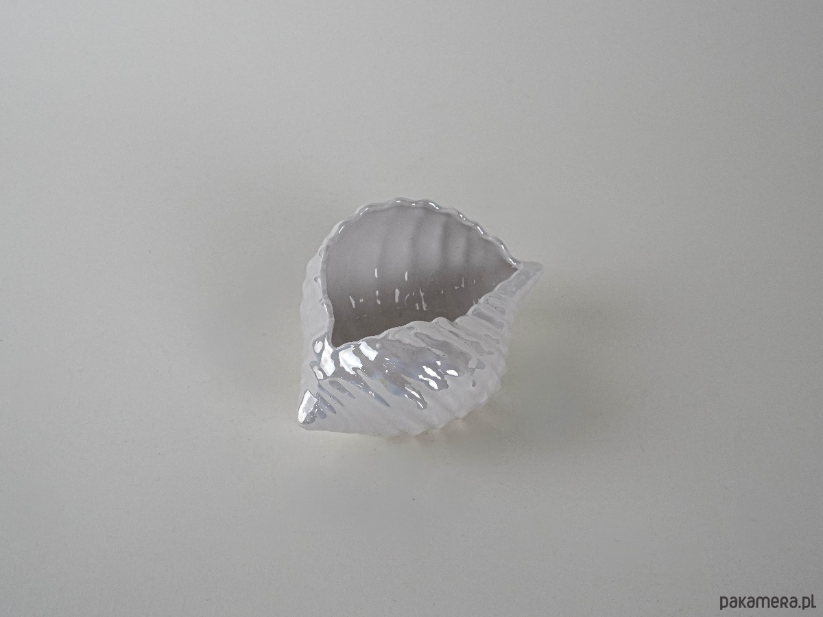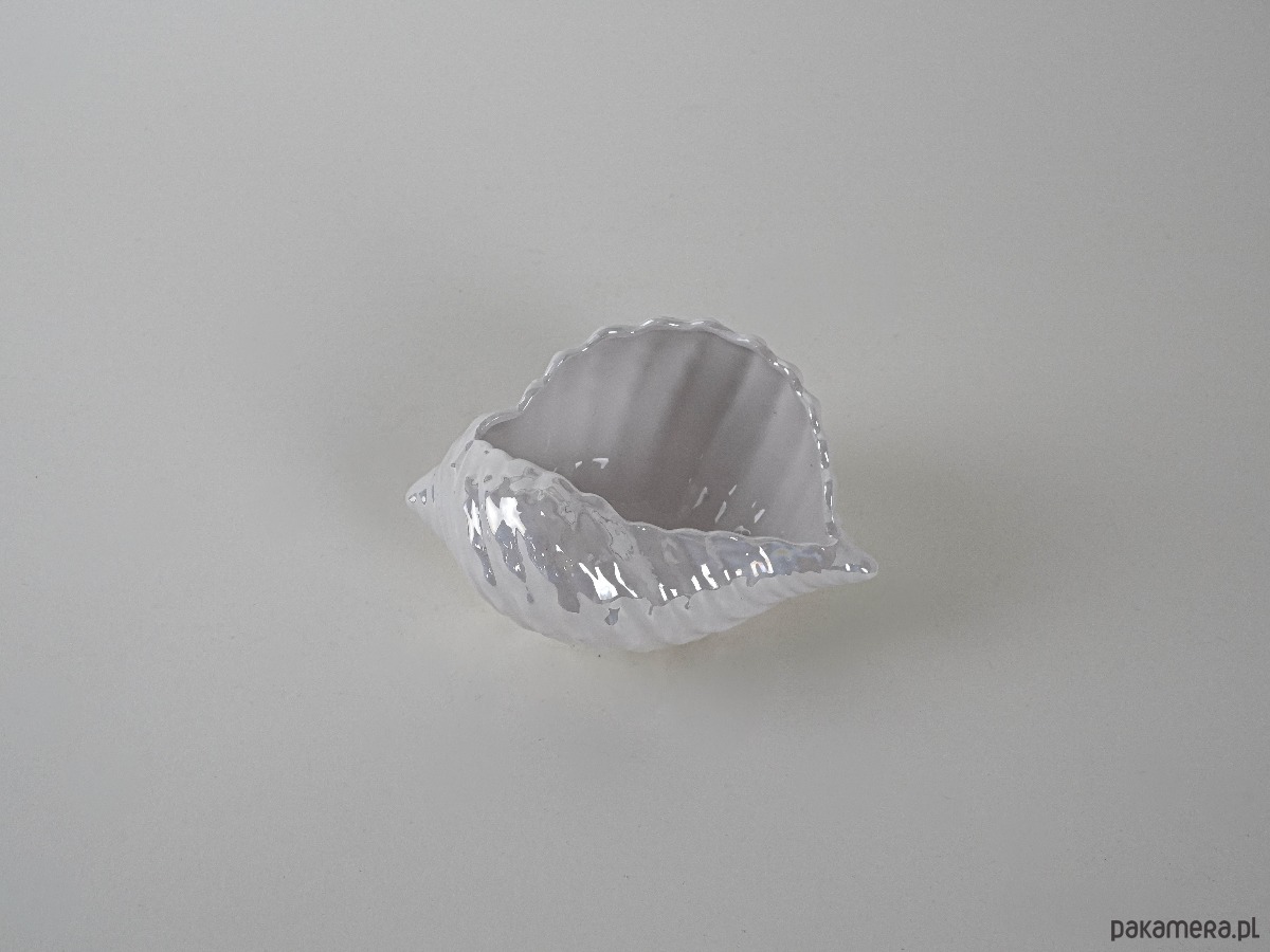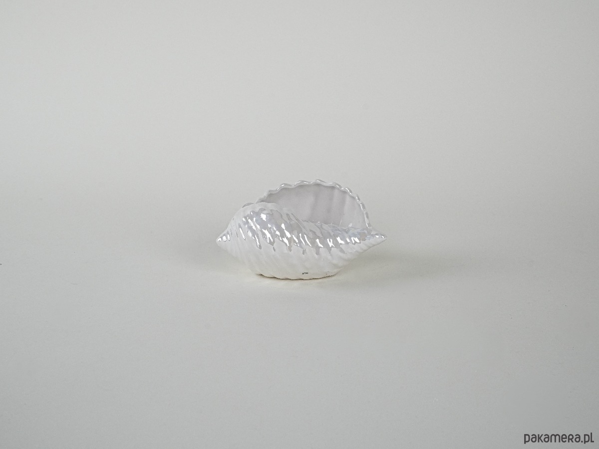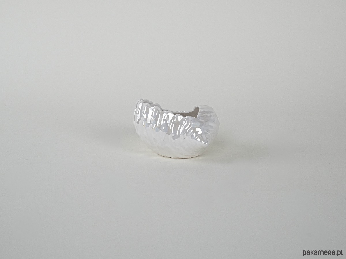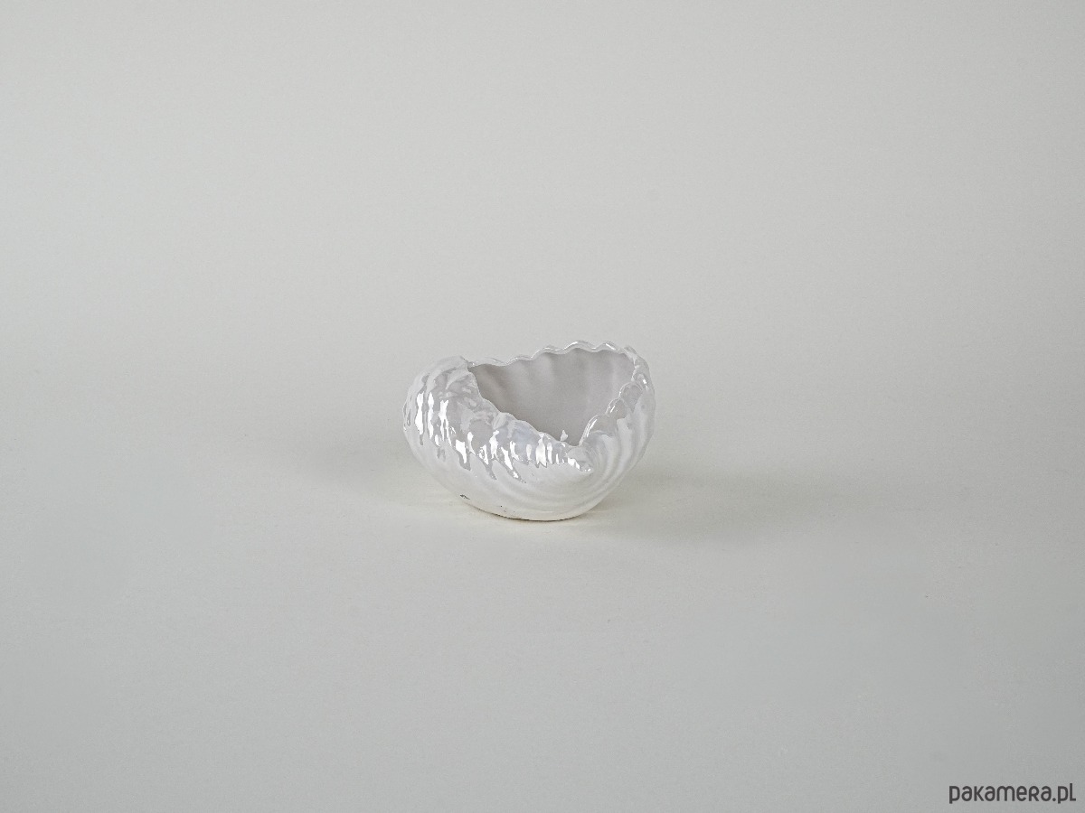 Ręcznie formowana dekoracja w kształcie muszli, wykonana z porcelany (lub wysokiej jakości fajansu) i pokryta szkliwem perłowym, które w świetle tworzy subtelne tęczowe refleksy. Formy tego typu były popularne w latach 60.–80. XX wieku, szczególnie w manufakturach włoskich, niemieckich i hiszpańskich, gdzie często stanowiły element luksusowych aranżacji wnętrz. Muszla może pełnić funkcję czysto dekoracyjną lub użytkową – jako misa na słodycze czy drobne przedmioty. Opalizująca powierzchnia pięknie podkreśla jej organiczną formę.