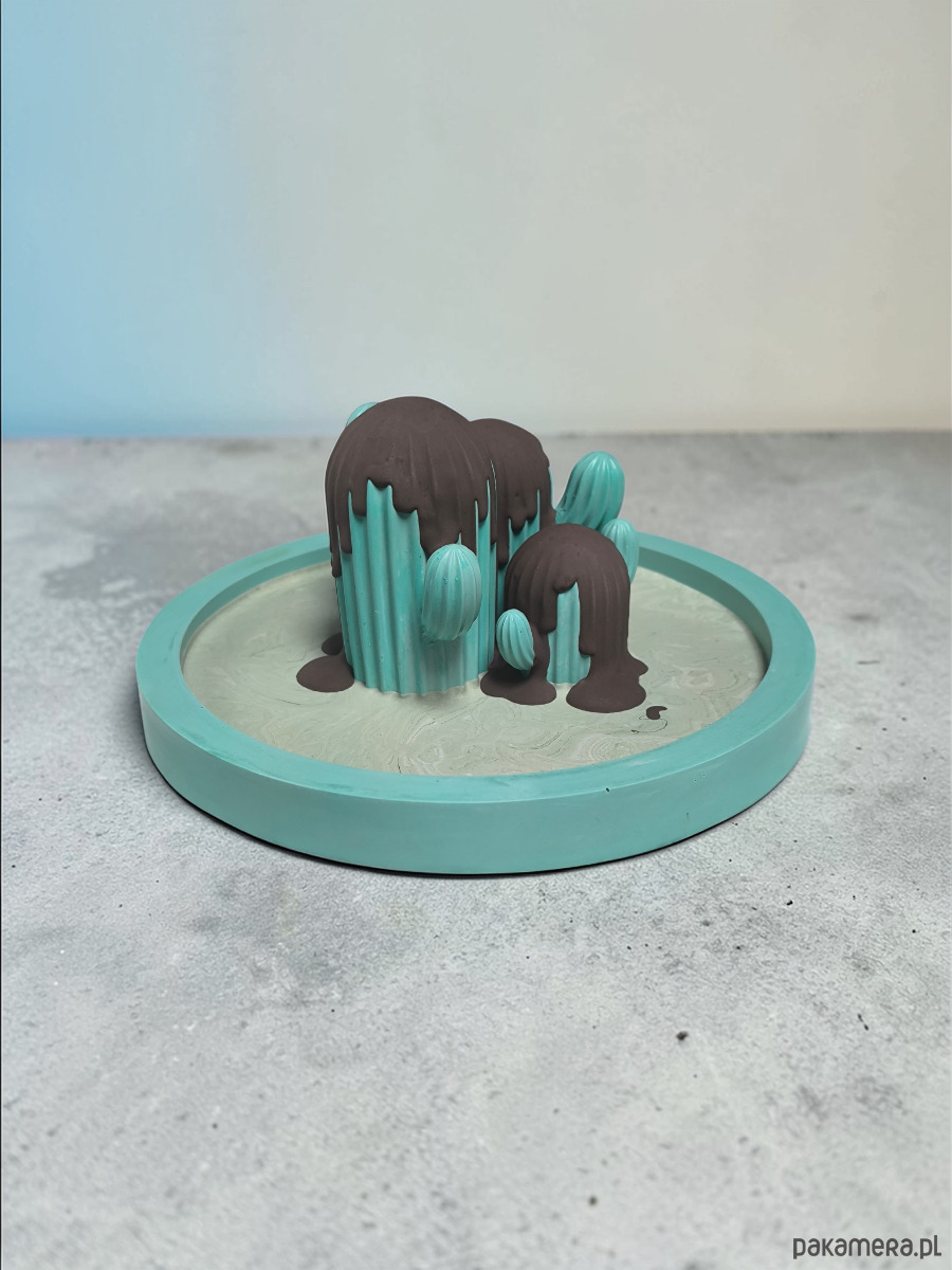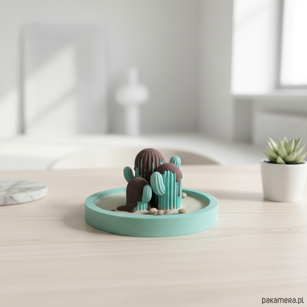 Oryginalna podstawka dekoracyjna wykonana ręcznie z gipsu polimerowego w formie stylizowanych kaktusów. To wyjątkowy element wystroju wnętrza, który łączy funkcjonalność z nowoczesnym designem.