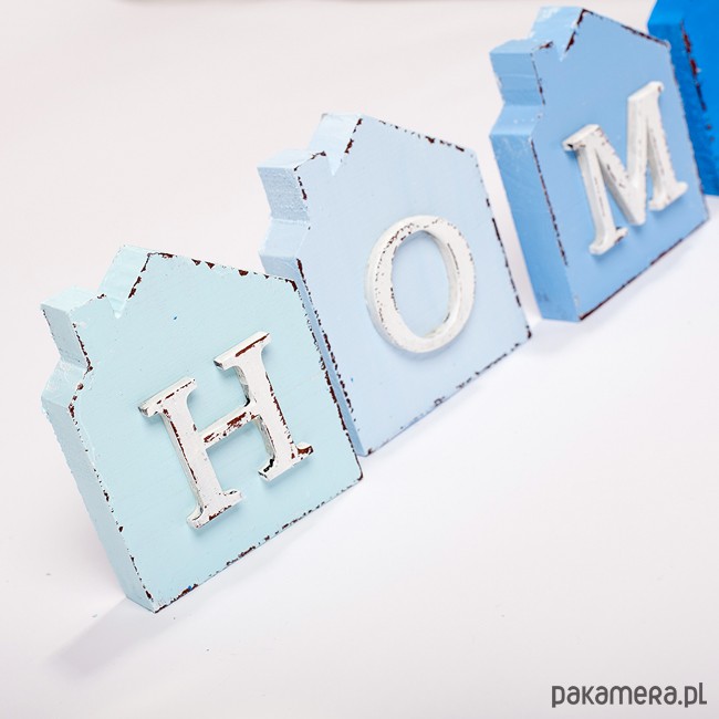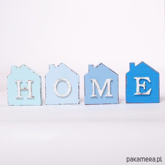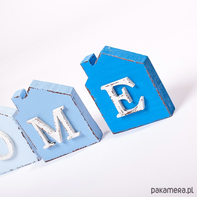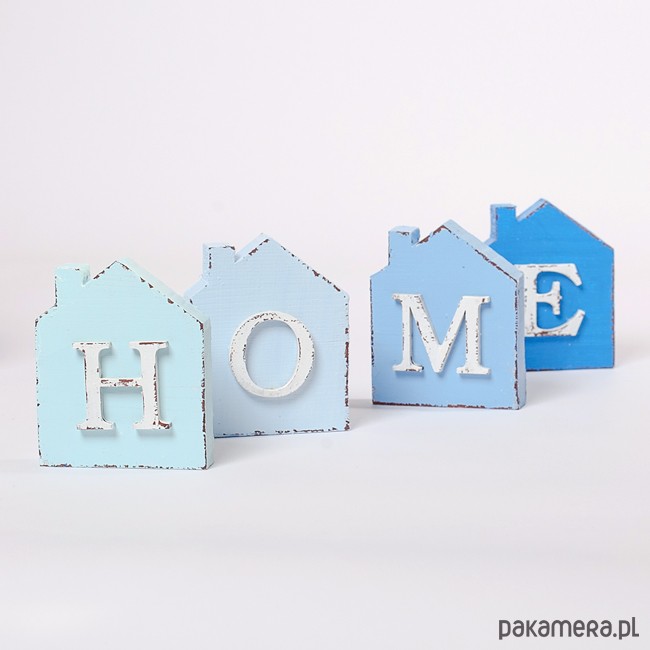 Komplet 4 ozdobnych domków w odcieniach błękitu i niebieskiego Każdy domek wykonany jest z drewna sosnowego . Wymiar każdego domku: wysokość ok. 9,5 cm szerokość ok. 8 cm