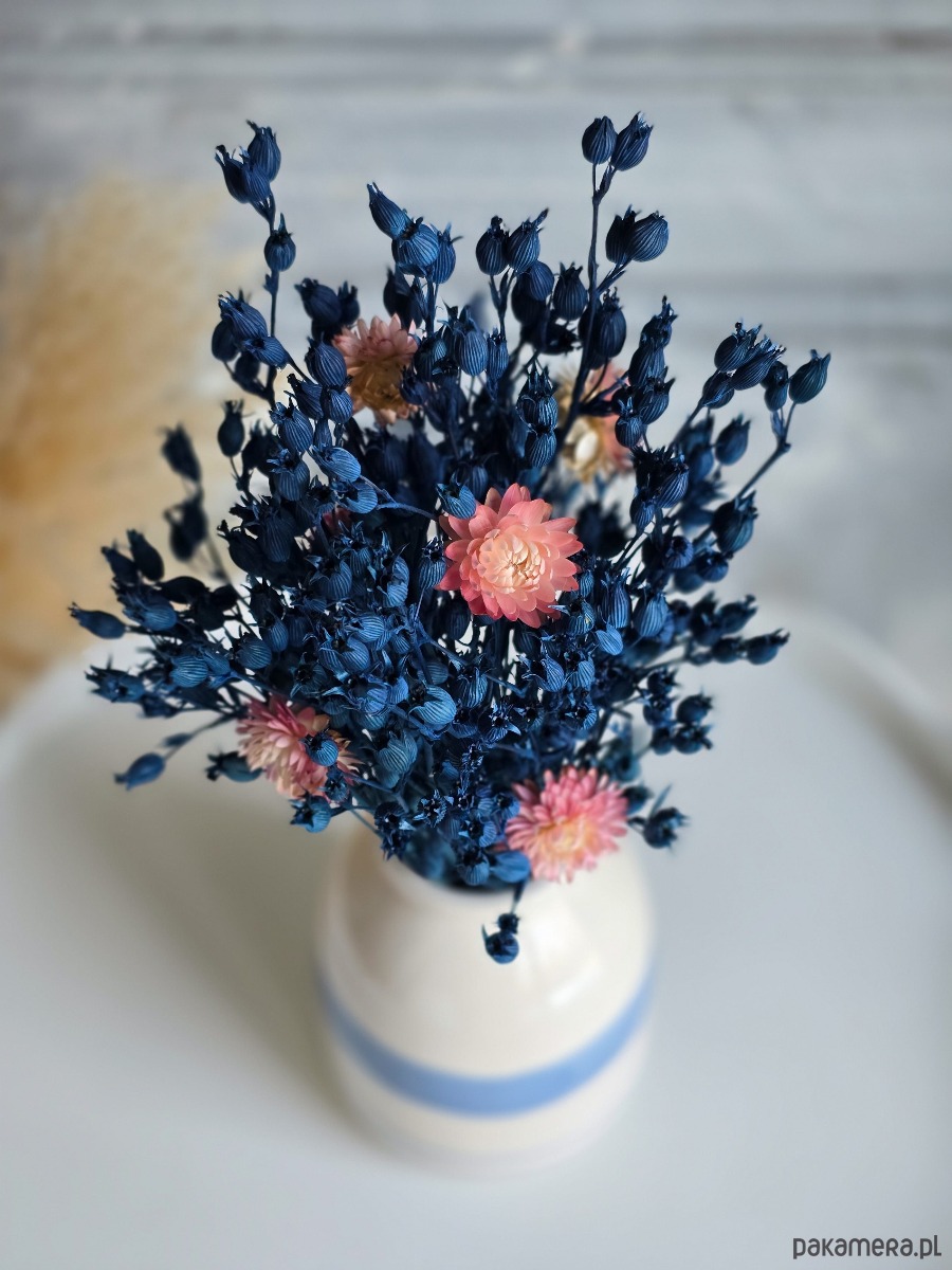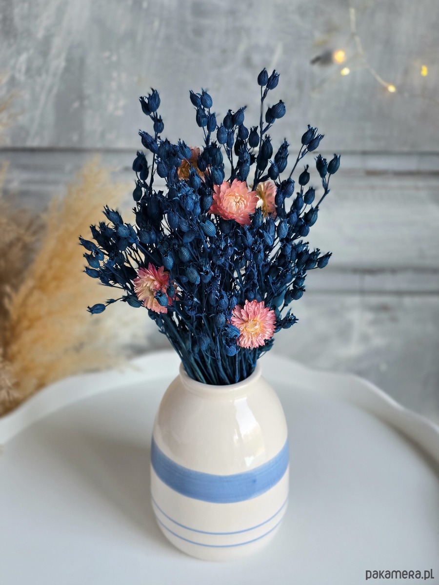 Granatowo-różowy bukiet z suszonych kwiatów to prosty sposób, żeby dodać wnętrzu koloru. Wystarczy włożyć go do wazonu i ustawić na stole, komodzie lub półce - bez obaw, że zwiędnie.