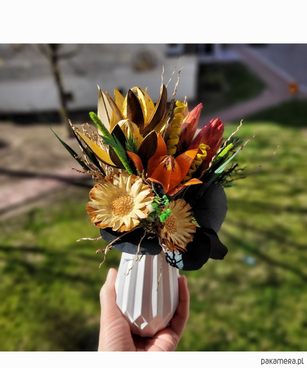 Dekoracyjny bukiet z suszonych kwiatów w eleganckim wazonie