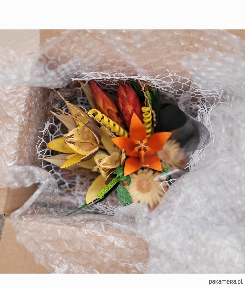 Przesyłka tego zestawu jest całkowicie bezpieczna. Gotowy bukiet jest starannie związany i pakowany oddzielnie, co zapobiega uszkodzeniom podczas transportu. W domu wystarczy tylko delikatnie umieścić bukiet w wazonie.