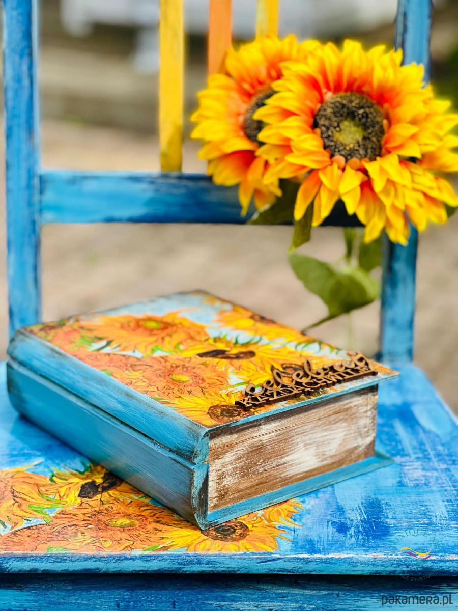 Dekoracyjny kufer książka ze słonecznikami, idealny na prezent, cytat