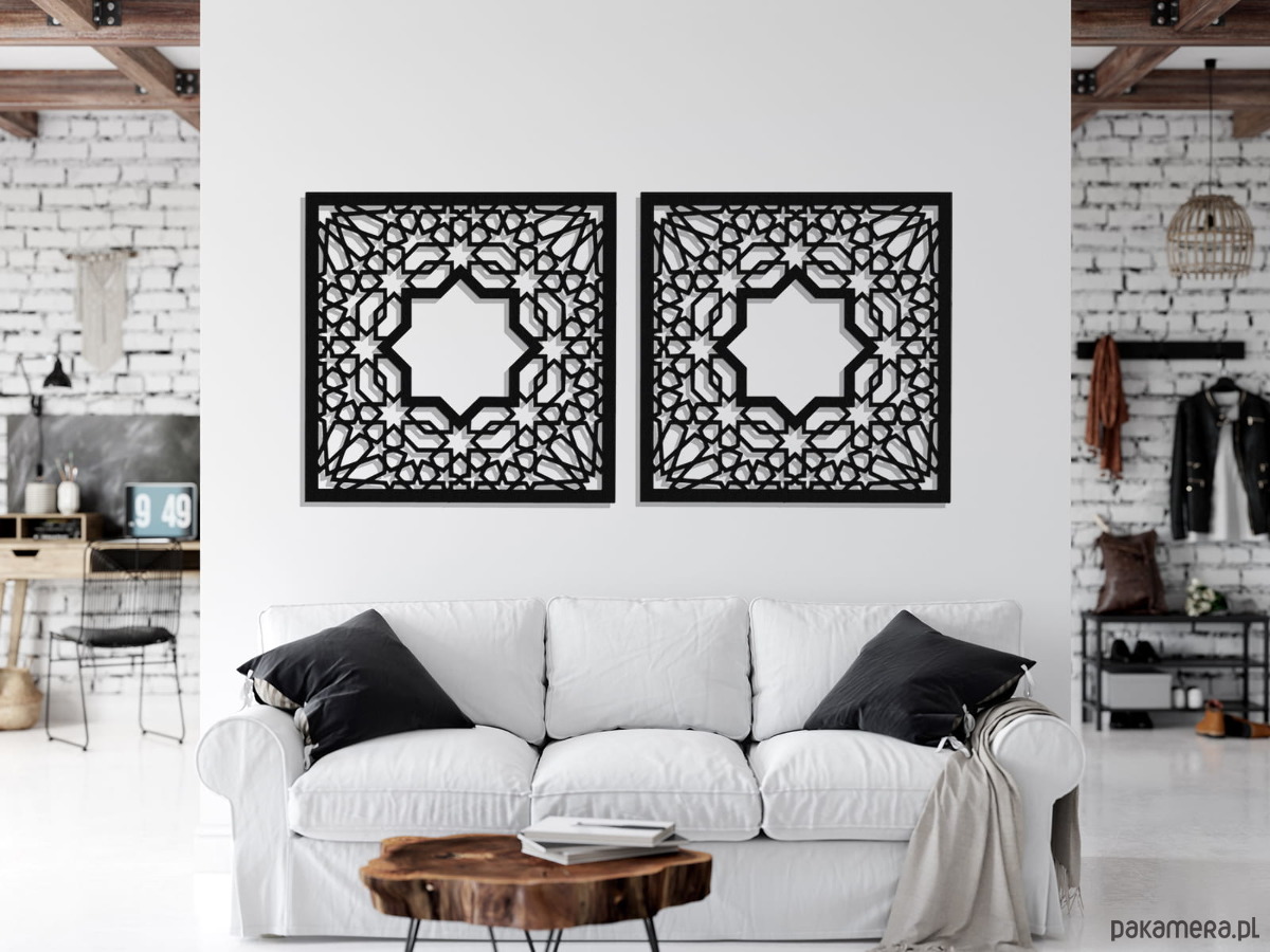 Ornament-arabeska wyróżnia się niezwykle misternym wzorem. W obrębie ramek znajdziemy zarówno małe kropelki, ozdobne gwiazdki oraz płatki kwiatów, które cieszą koronkowym wycięciem. Ozdoby na ścianę w stylu orientalnym najlepiej prezentują się w duetach, ale nic nie stoi na przeszkodzie, by powiesić tuż obok siebie trzy panele ażurowe ze sklejki. Zwielokrotniony marokański motyw doda pomieszczeniu elegancji i wyjątkowego klimatu.