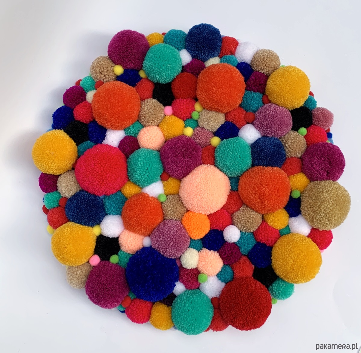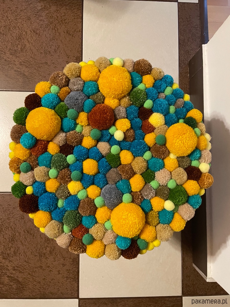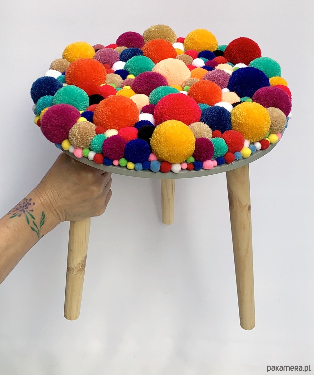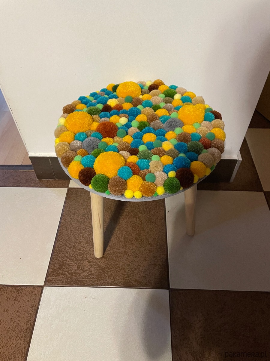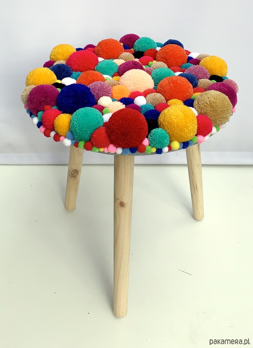 Dekoracyjny stoleczke, wykonany z drewna, dodatkiem są kolorowe pompony różnej wielkości.
