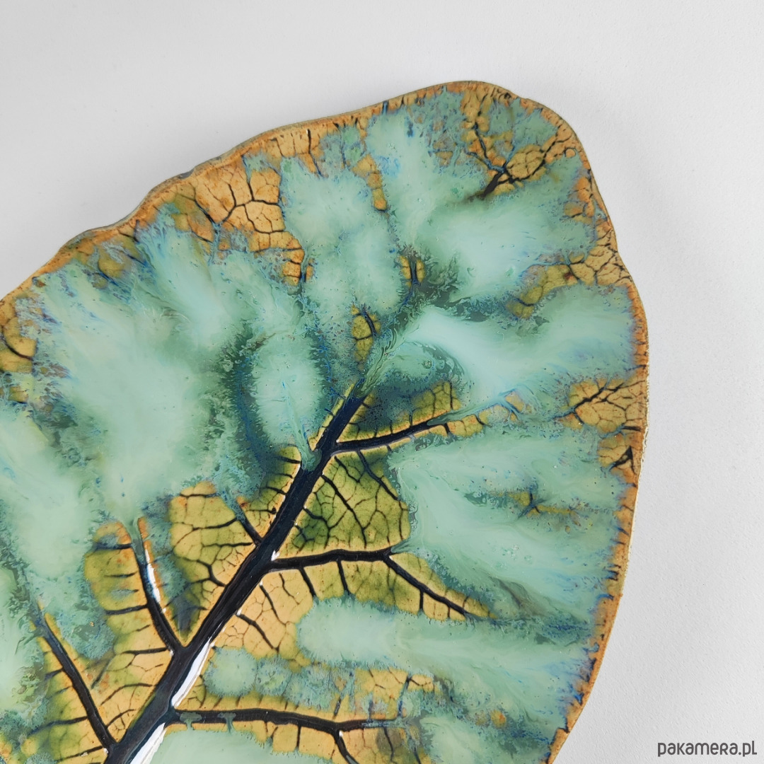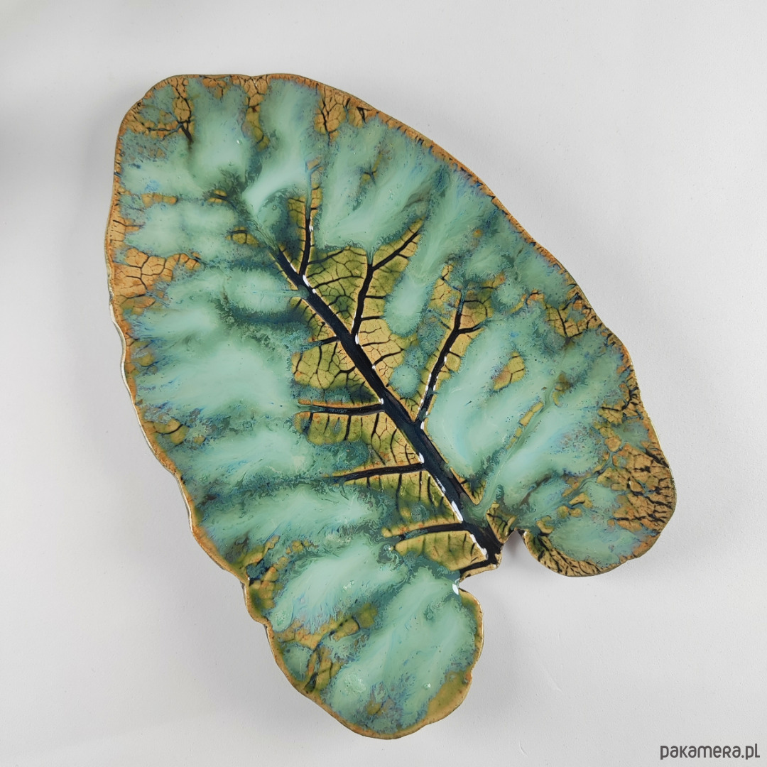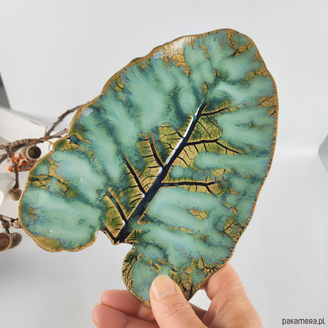 Ręcznie lepiony ceramiczny talerz/paterka w kształcie małego liścia łopianu.