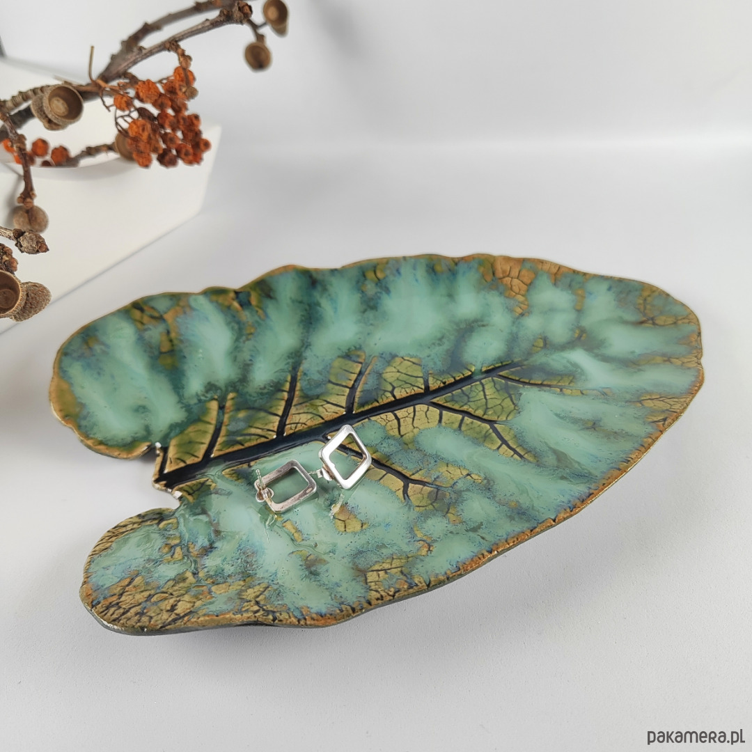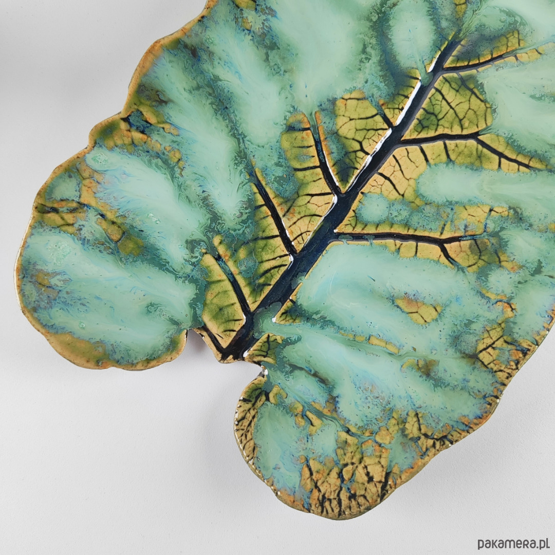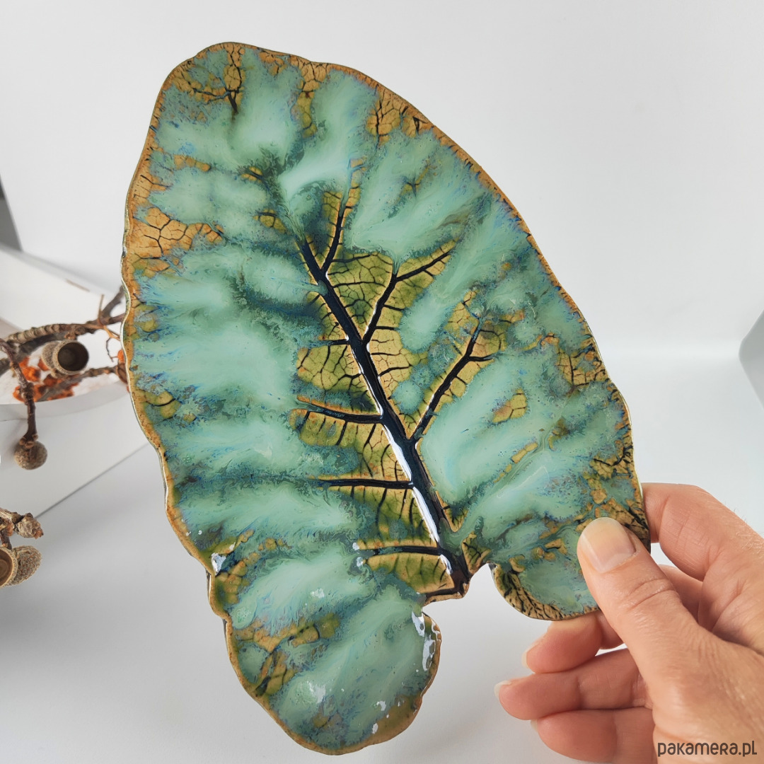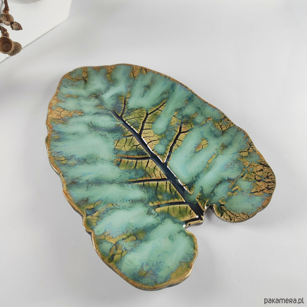 Ręcznie lepiony ceramiczny talerz/paterka w kształcie małego liścia łopianu.