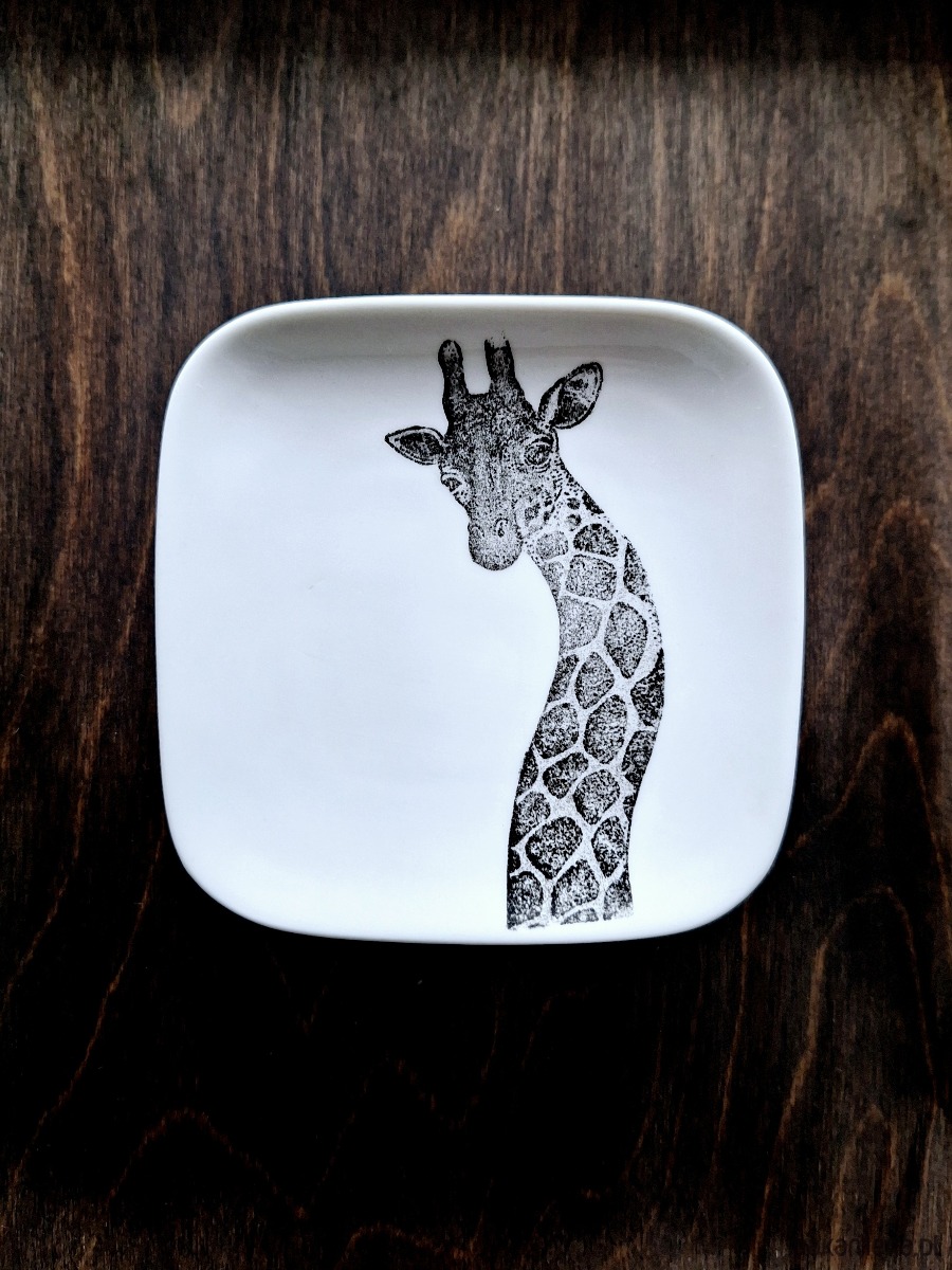 Dekoracyjny talerz ścienny z printem żyrafy. Talerz pochodzi z drugiej ręki, o charakterze vintage, starannie wyselekcjonowany o znikomym stopniu zużycia. Print naniesiony ręcznie. Talerz ma dekoracyjny charakter. Dekoraceję można powiesić na zawieszce umieszczonej z tyłu talerza, może również stanowić podstawkę na świece, biżuterię.