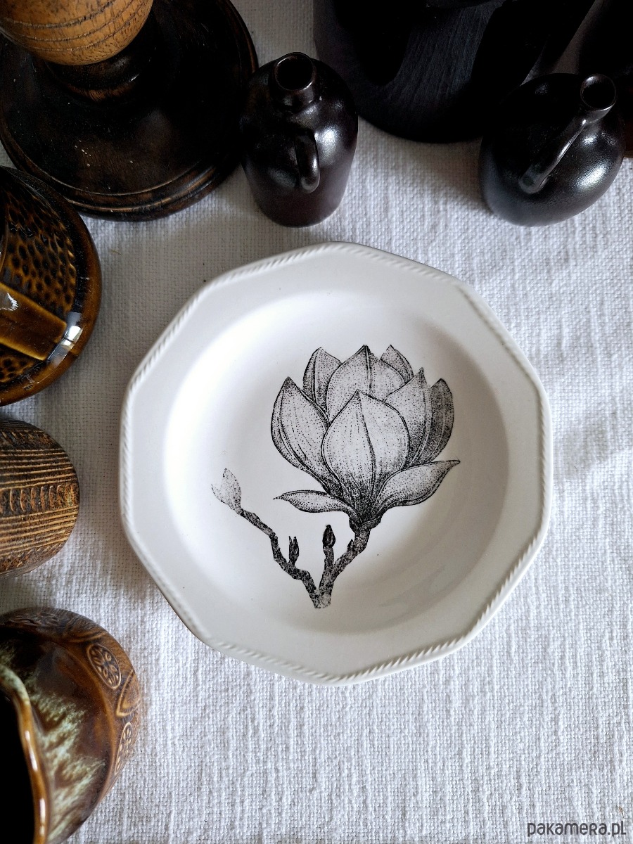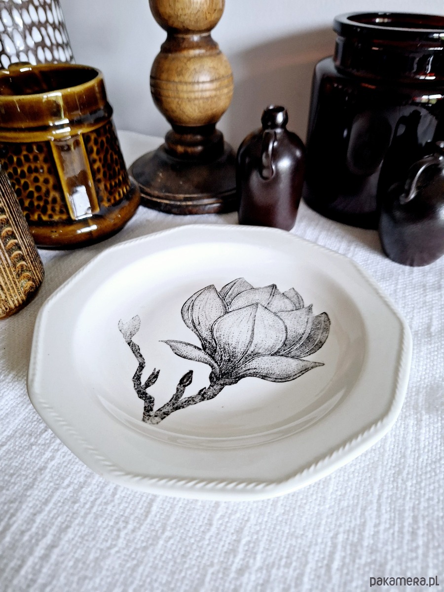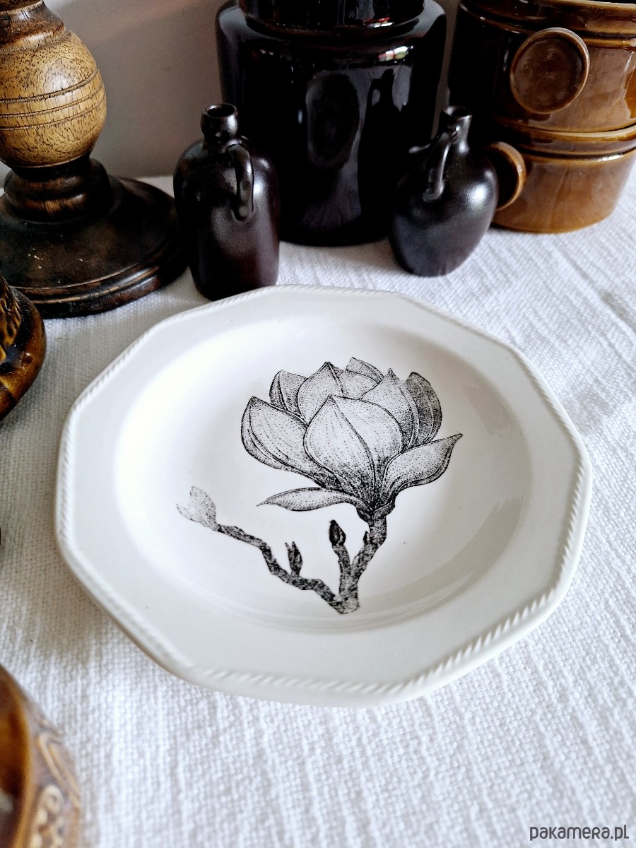 Dekoracyjny talerz ścienny z motywem roślinnym. Talerz pochodzi z drugiej ręki, o charakterze vintage, starannie wyselekcjonowany o znikomym stopniu zużycia. Talerz ma wyłącznie dekoracyjny charakter. Dekoraceję można powiesić na zawieszce umieszczonej z tyłu talerza, może również stanowić podstawkę na świece, biżuterię.
