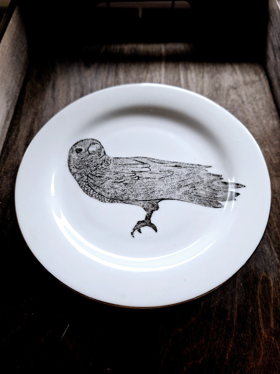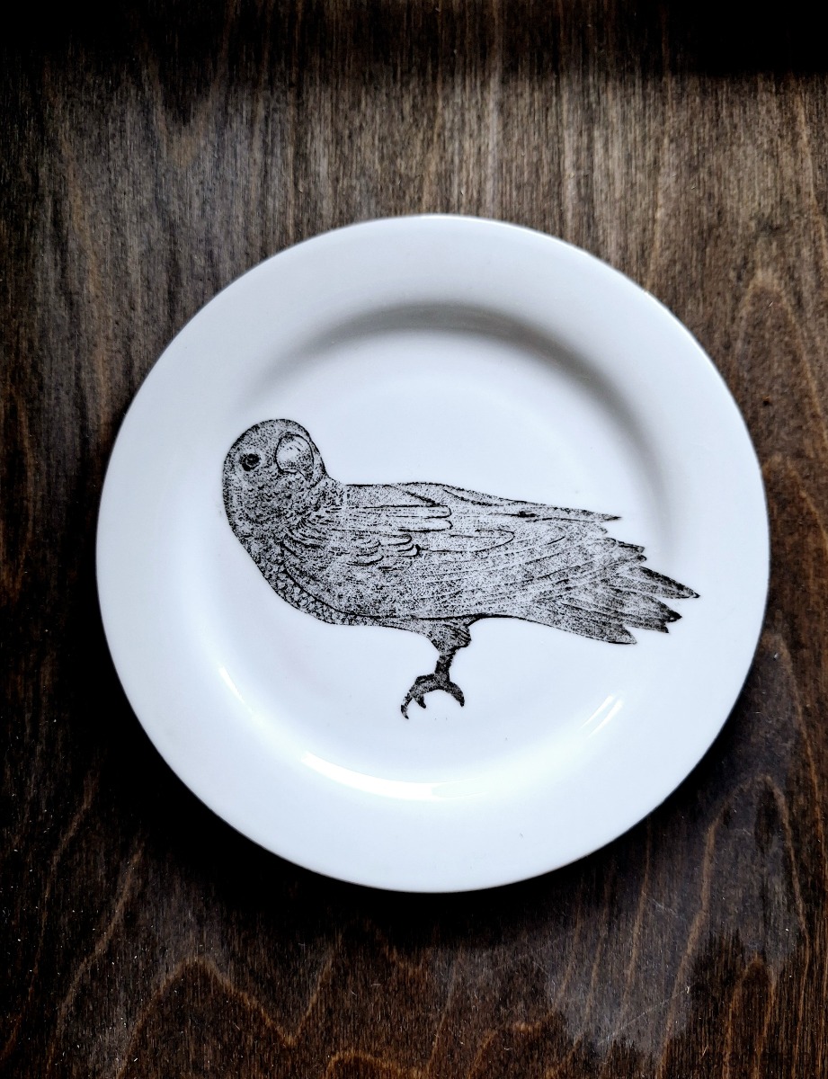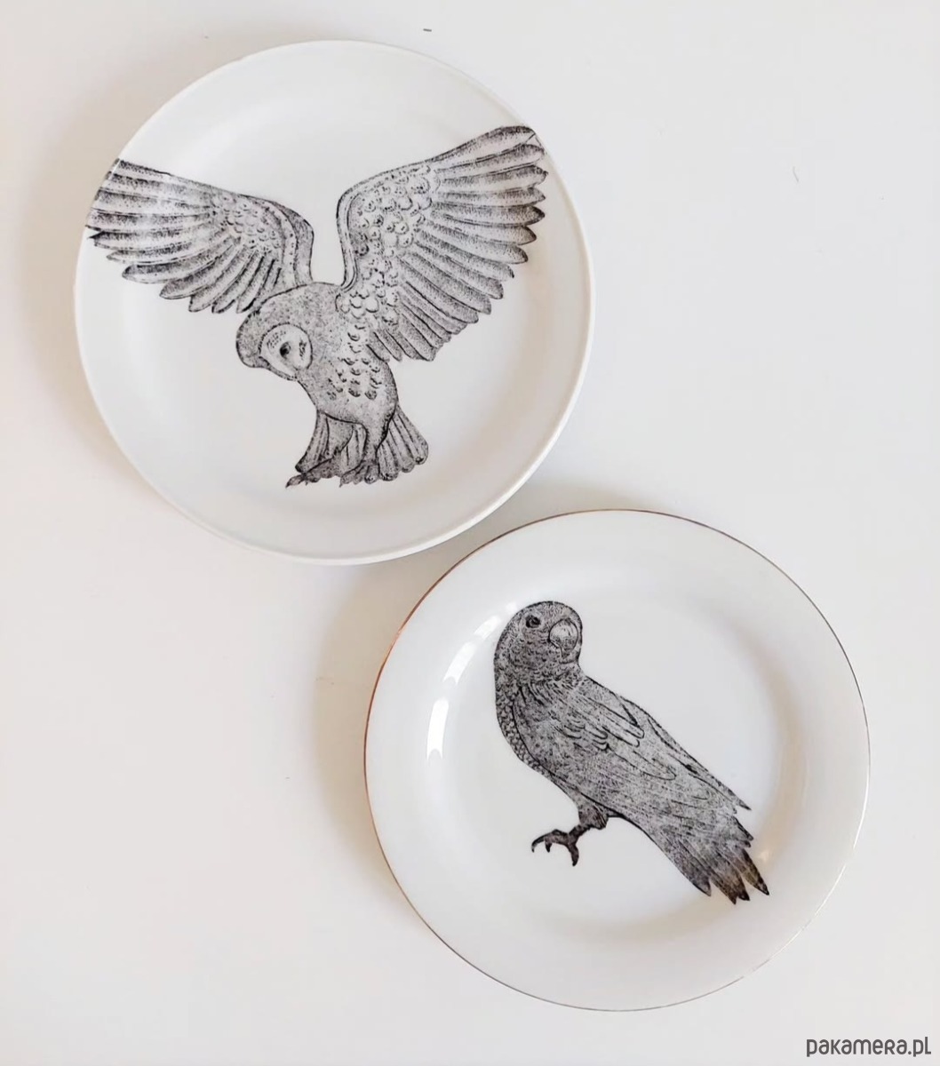 Dekoracyjny talerz ścienny z motywem ptaka. Talerz pochodzi z drugiej ręki, o charakterze vintage, starannie wyselekcjonowany o znikomym stopniu zużycia. Print naniesiony ręcznie. Talerz ma dekoracyjny charakter. Dekoraceję można powiesić na zawieszce umieszczonej z tyłu talerza, może również stanowić podstawkę na świece, biżuterię.