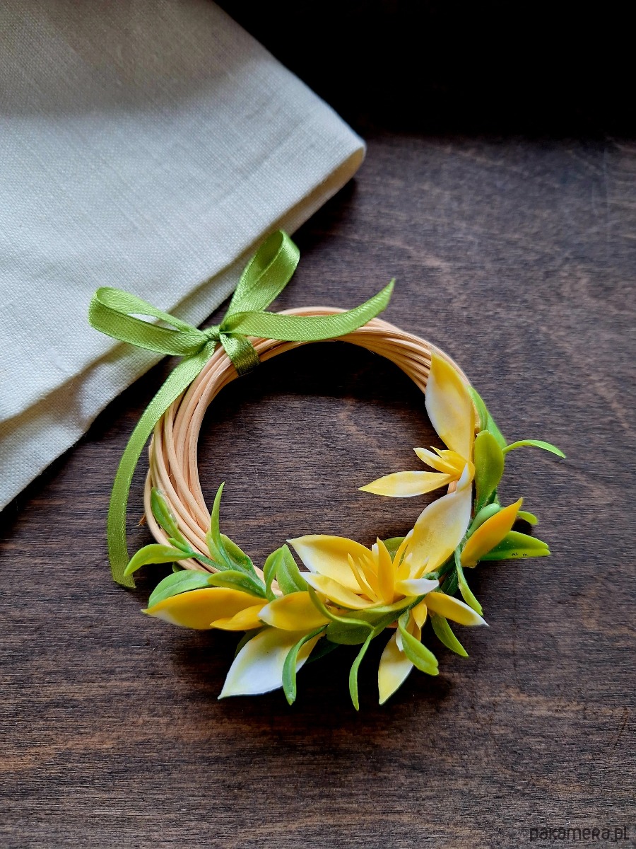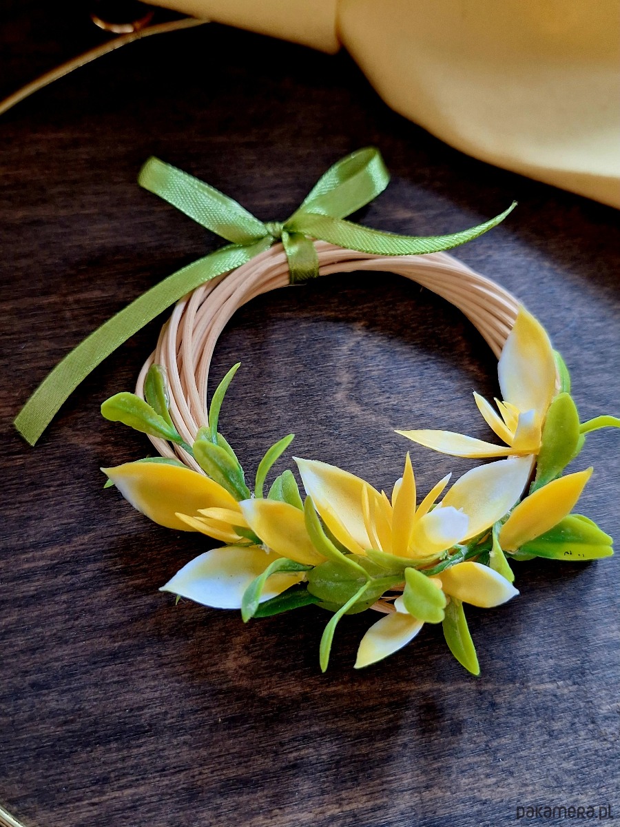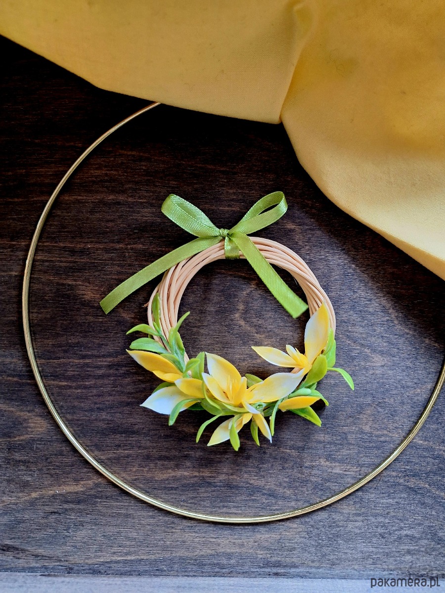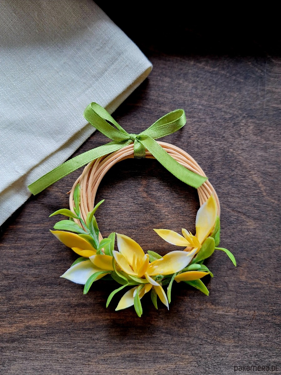 Dekoracyjny mini wianuszek ze sztucznych kwiatów. Wianek ręcznie formowany z wikliny zdobiony źóltymi kwiatami i zielonymi liśćmi. Całość udekorowana wstażką w kolorze zielonym. Wianek można powiesić na ścianie, może również być drobnym upominekiem na uroczystość chrztu lub ślubu dla gości, stanowić może również być unikatową dekorację stołu.