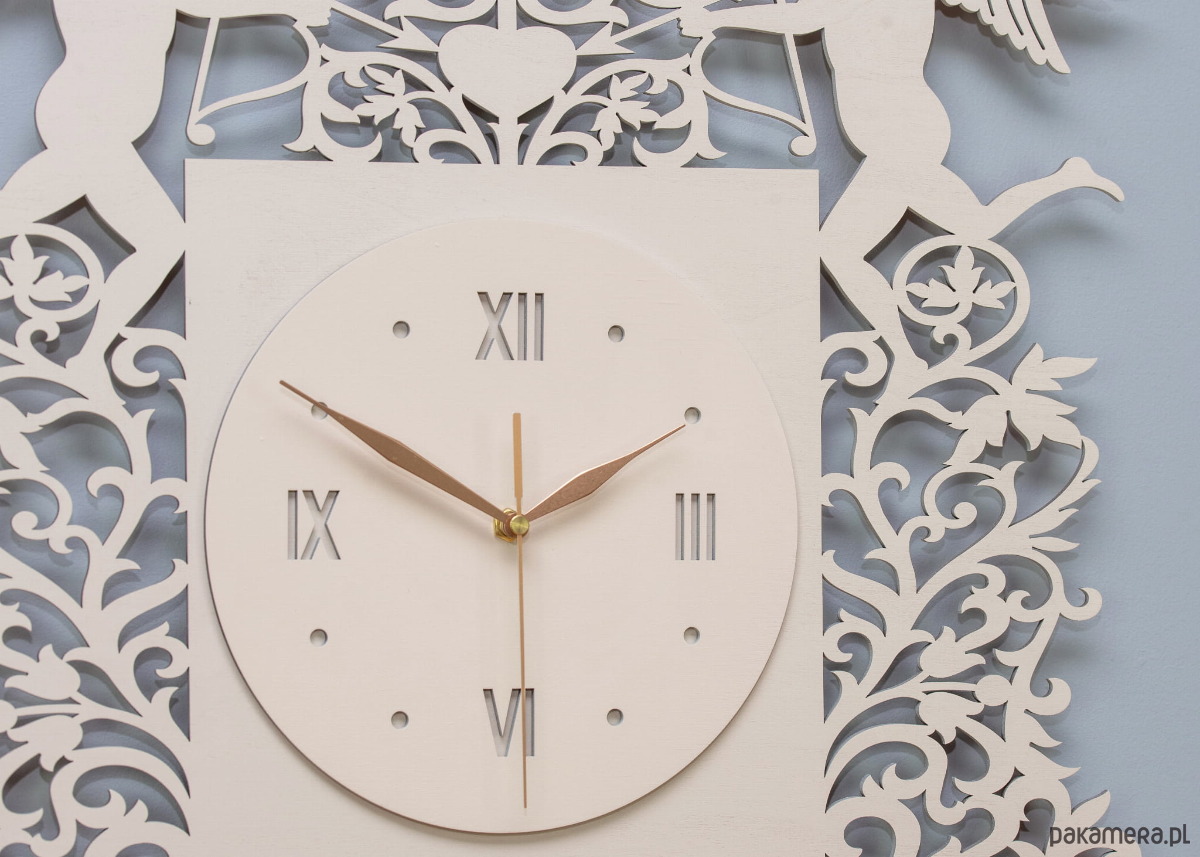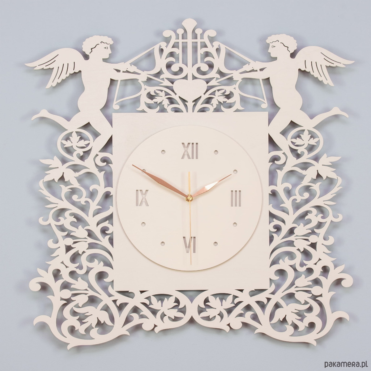 Dekoracyjny, ażurowy zegar z anielskim ornamentem nawiązującym do epoki baroku.