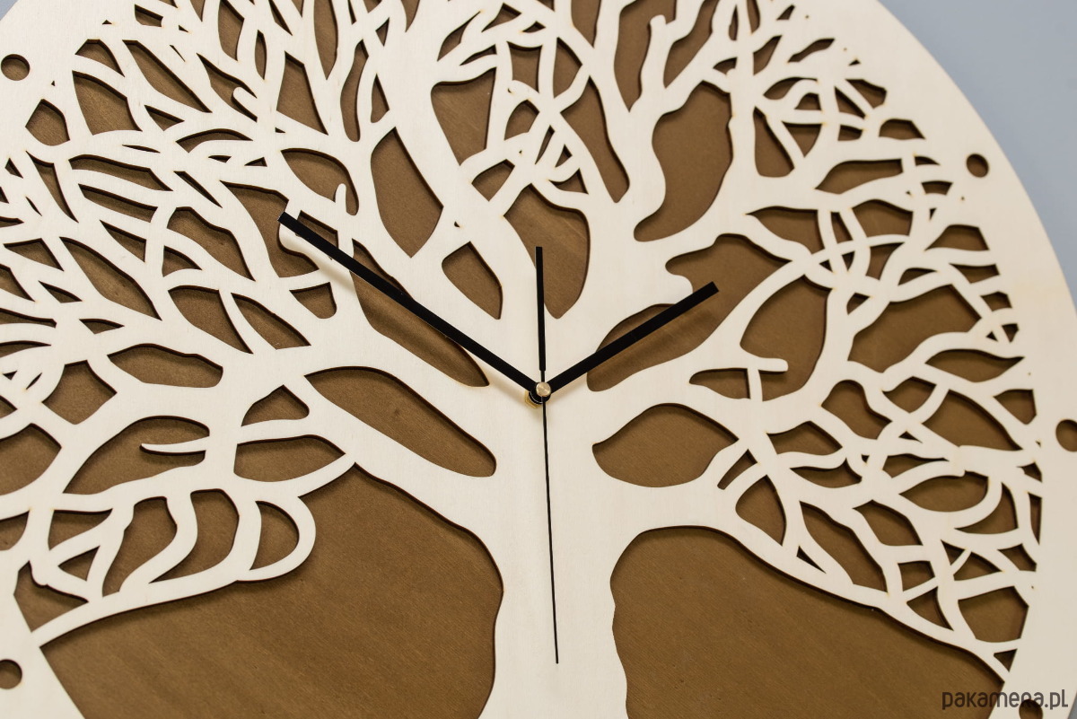 Dekoracyjny, ażurowy zegar z motywem drzewa życia. Piękna rustykalna dekoracja do naturalnych wnętrz w stylu skandynawskim.