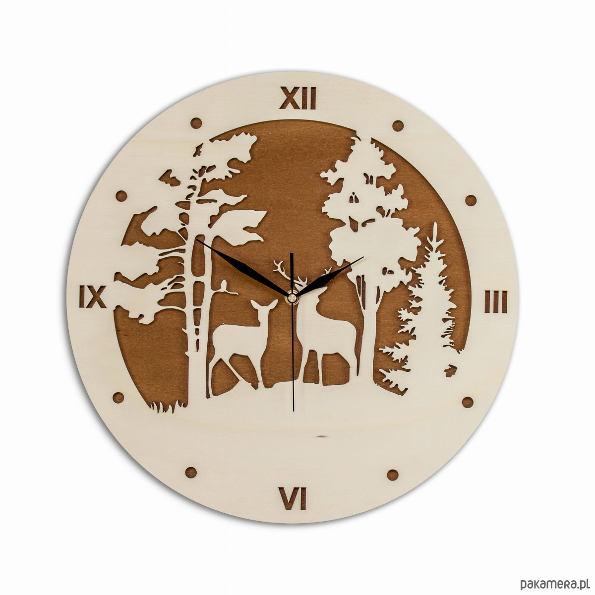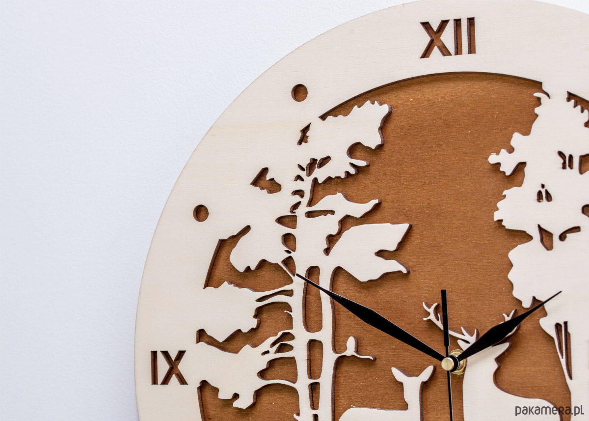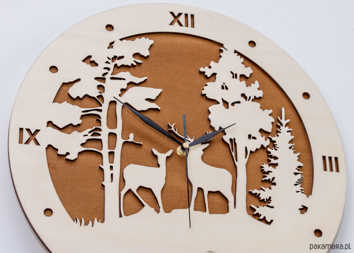 Dekoracyjny, ażurowy zegar z motywem jelonków i lasu. Rustykalny styl do wnętrz inspirowanych skandynawskim designem.