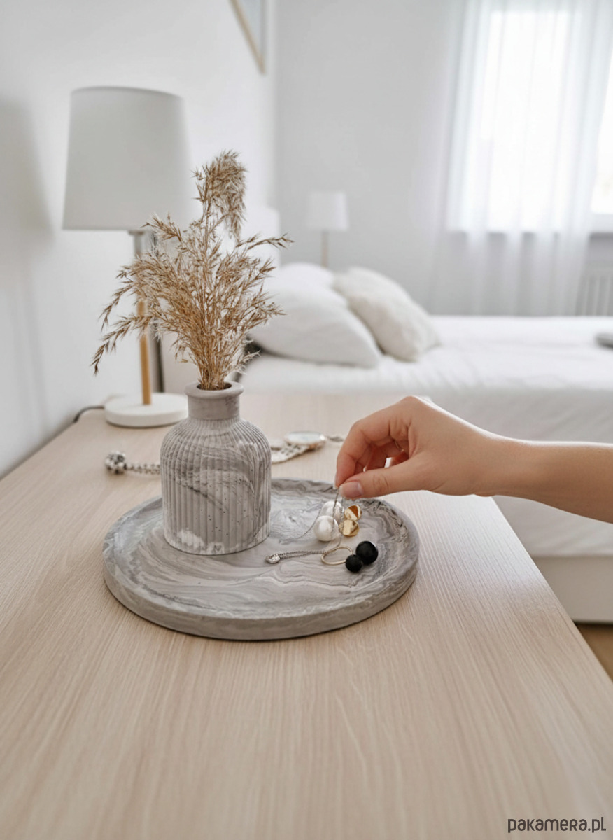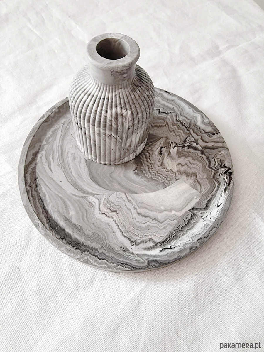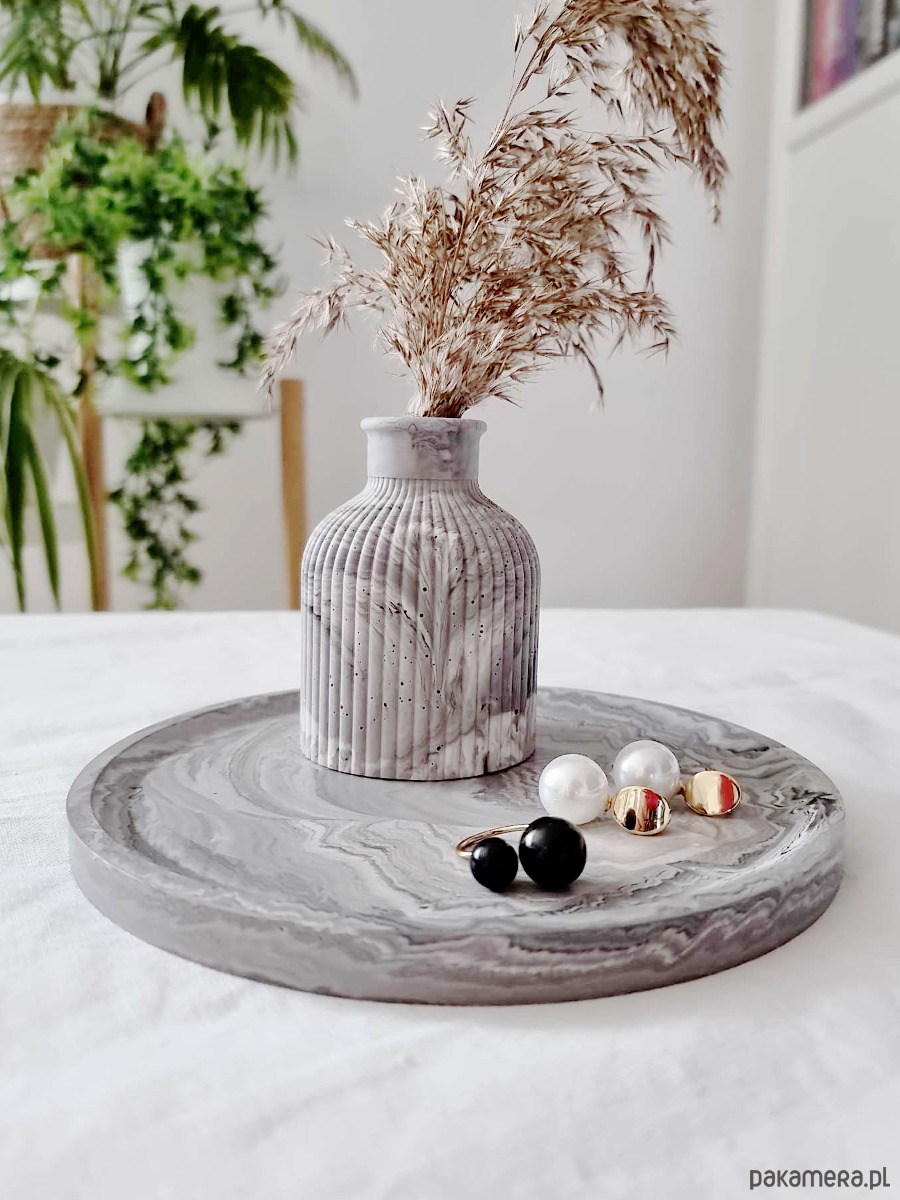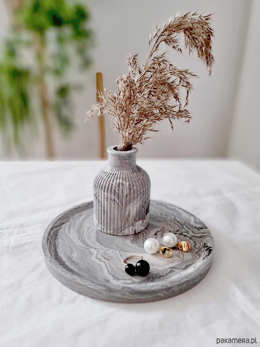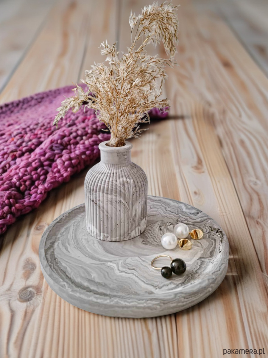 Ożyw swoją przestrzeń przechowywania biżuterii tym eleganckim zestawem dekoracyjnym z gipsu polimerowego. Zestaw składa się z okrągłej podstawki na biżuterię i wazonika na suszki. Wzór marmurkowy w odcieniach szarości. Wykonany własnoręcznie z gipsu, prezentuje się niezwykle elegancko i może być oryginalnym prezentem dla bliskiej osoby. Dodaj stylu i charakteru swojej przestrzeni dzięki temu wyjątkowemu zestawowi dekoracyjnemu.