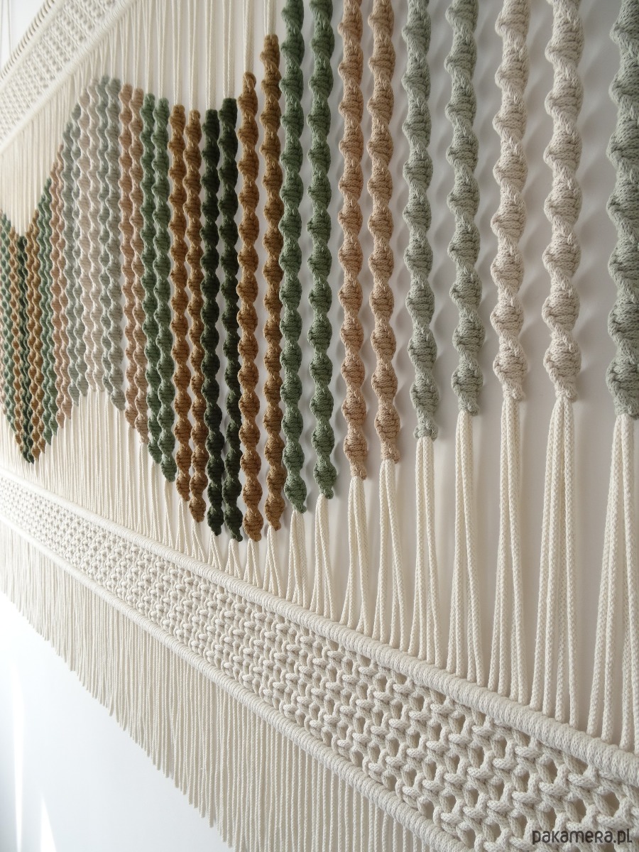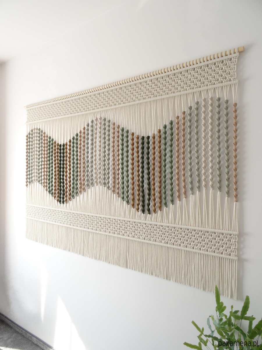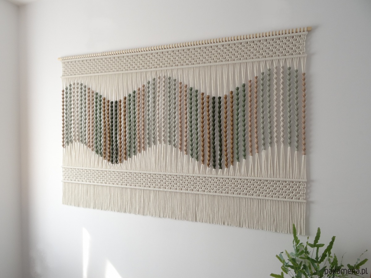 Imponująca makrama na ścianę z kolekcji "Seaside Dunes" w subtelnych odcieniach zieleni i beżu to unikalna dekoracja ścienna, która wprowadzi do Twojego wnętrza nutę natury i harmonii. Misternie pleciony wzór, inspirowany nadmorskim krajobrazem, przyciąga wzrok doskonale dobraną paletą barw, tworząc przytulną i elegancką atmosferę. Każdy detal został wykonany z najwyższą starannością, dzięki czemu ta unikalna dekoracja stanie się centralnym punktem każdej aranżacji, nadając jej niepowtarzalny charakter.