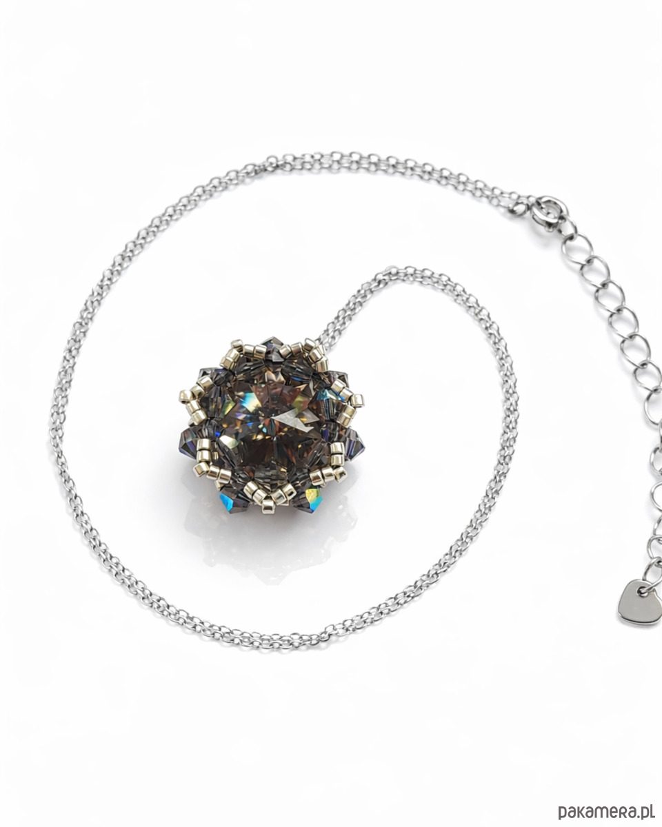Sercem naszyjnika jest zawieszka z kryształem Preciosa Rivoli Maxima 14 mm w kolorze Black Diamond, opleciona kryształkami Preciosa Bicone 3 i 4 mm oraz srebrnymi koralikami Miyuki Delica. Zawieszka ma ok. 2,7 cm wysokości i 2,5 cm szerokości. Całość zawieszona została na łańcuszku typu ankier ze stali nierdzewnej.
