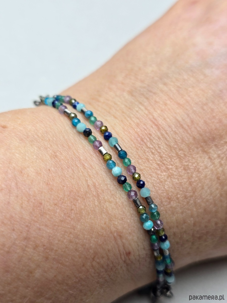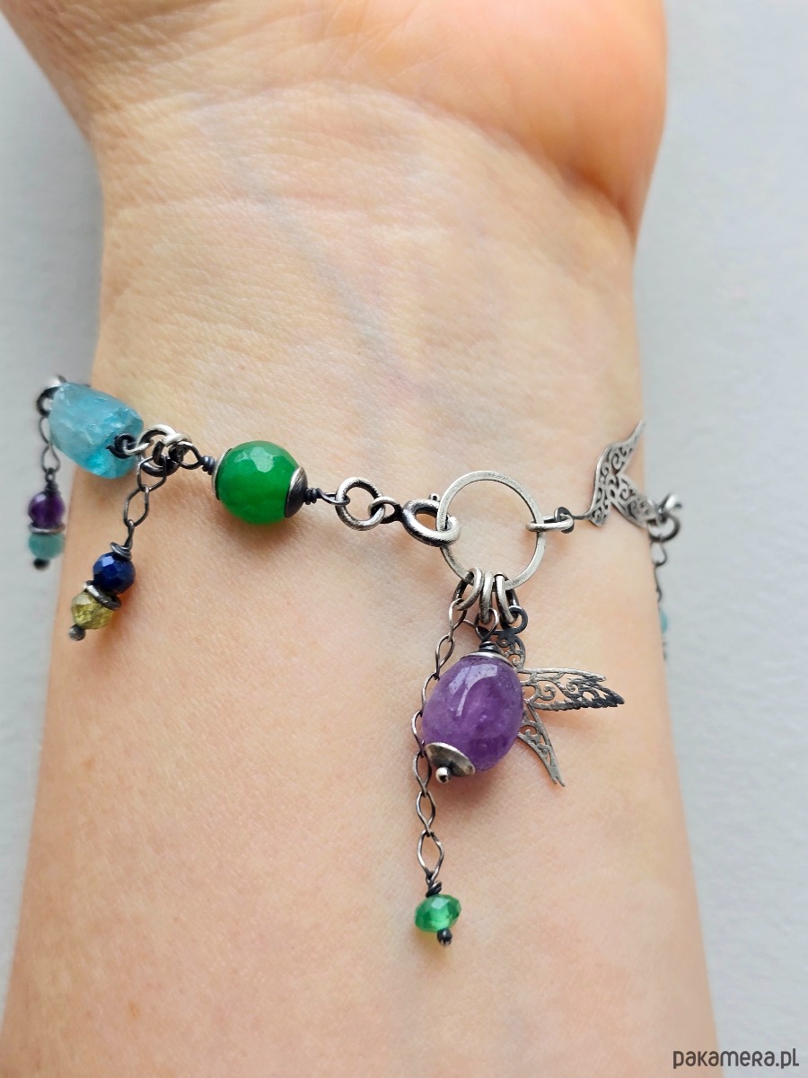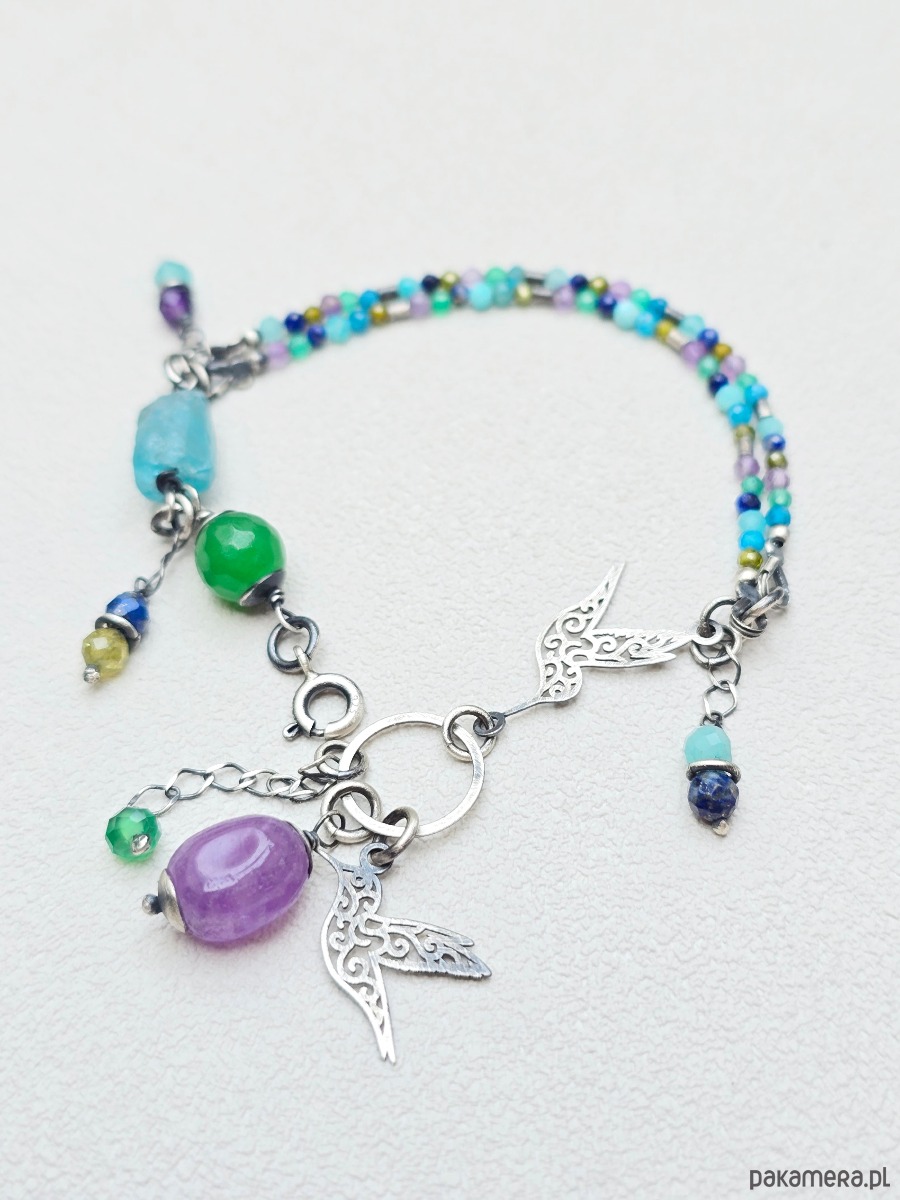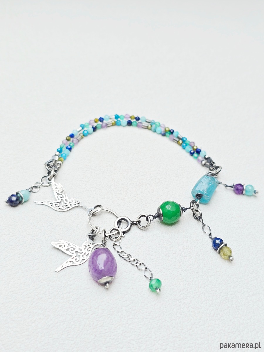 Unikatowa bransoletka z motywem kolibrów. Wykonana z kamieni naturalnych w przedziale wielkosci od 2mm do 8mm tj.: ametyst, lapis lazuli, zielony onyks, zielony turmalin, amazonit, apatyt.