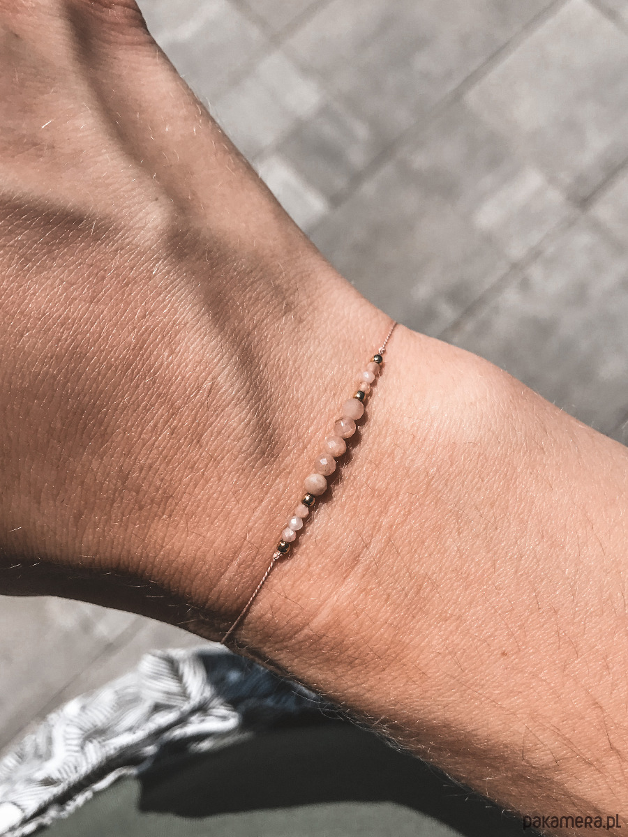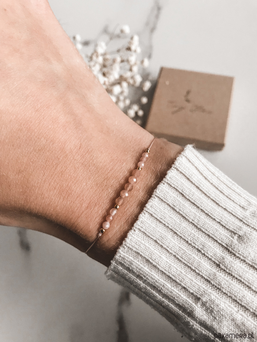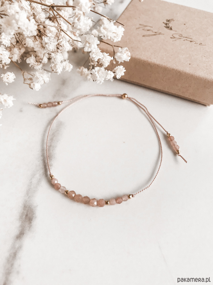 Bransoletka wykonana na jedwabnej nici z kamienia słonecznego oraz srebrnych koralików próby 925 pozłacanych 24K złotem. Piękny brzoskwiniowo- beżowy kolor kamienia słonecznego to propozycja delikatnej i subtelnej biżuterii.