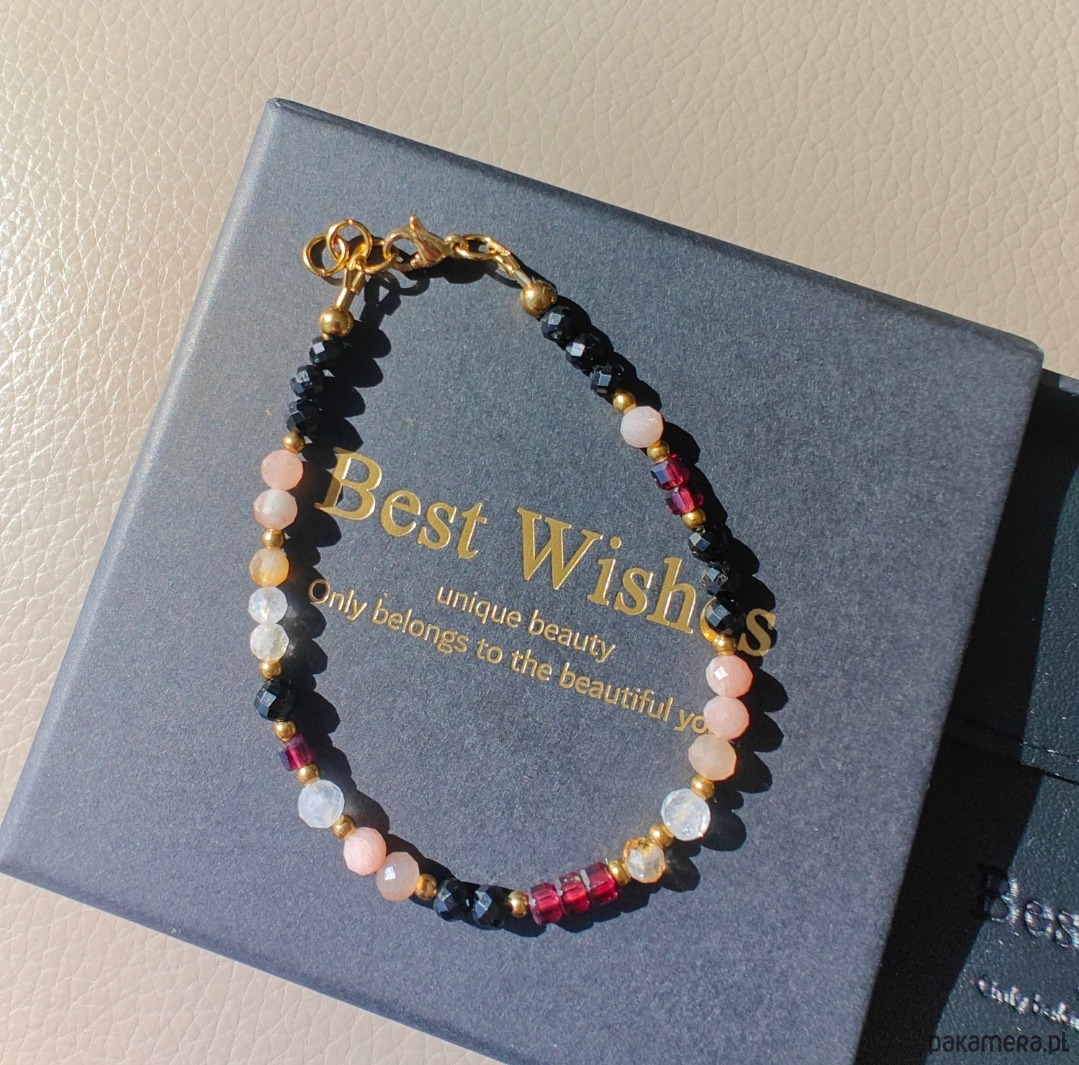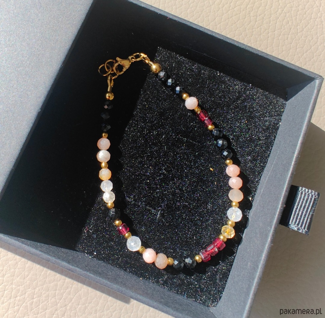 Bransoletka wykonana z turmalinu, kamienia księżycowego, cytrynu oraz granatu. Długość 17,5 cm + 1 cm regulacji, dzięki czemu można ją wygodnie dopasować do nadgarstka.