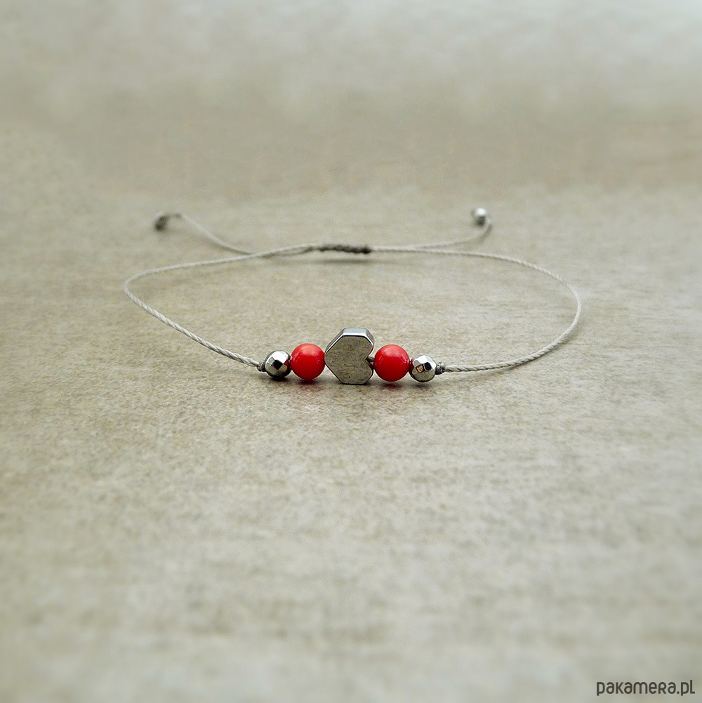 hematyt srebrne serce 6x6 mm, koral czerwony kulka 4 mm, hematyt kulki ozdobne 2 mm, szary sznurek syntetyczny